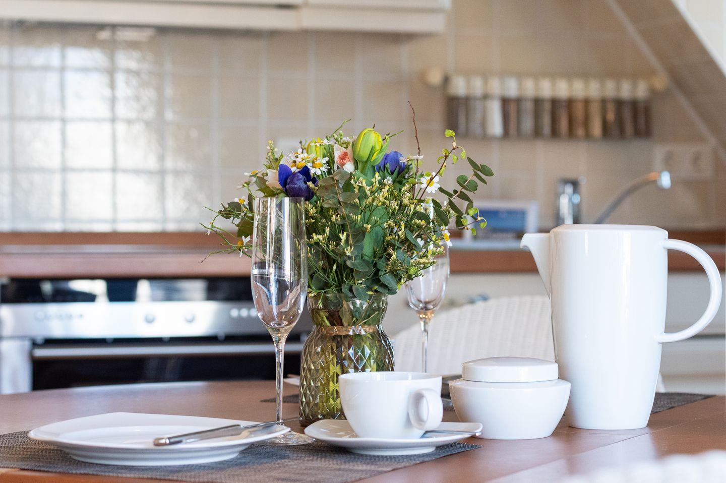 Wohn-/Koch-/Essbereich: Die mit allem Komfort ausgestattete Küchenzeile wird durch einen Wasch-Trockner ergänzt. Ein großzügiger Essbereich mit Blick auf den TV lädt zum Verweilen ein. Abgerundet wird der Raum durch ein gemütliches Ecksofa, das auch als hochwertiges Schlafsofa für zwei weitere Personen dient. Auf dem großen West-Balkon, zum Teil mit Meerblick, können Sie Ihre Seele baumeln lassen. Zusätzlich befindet sich im südlichen Teil des Grundstückes ein windgeschützter Sonnenbereich, wo zur Sommerzeit ein Strandkorb für Sie bereit steht.