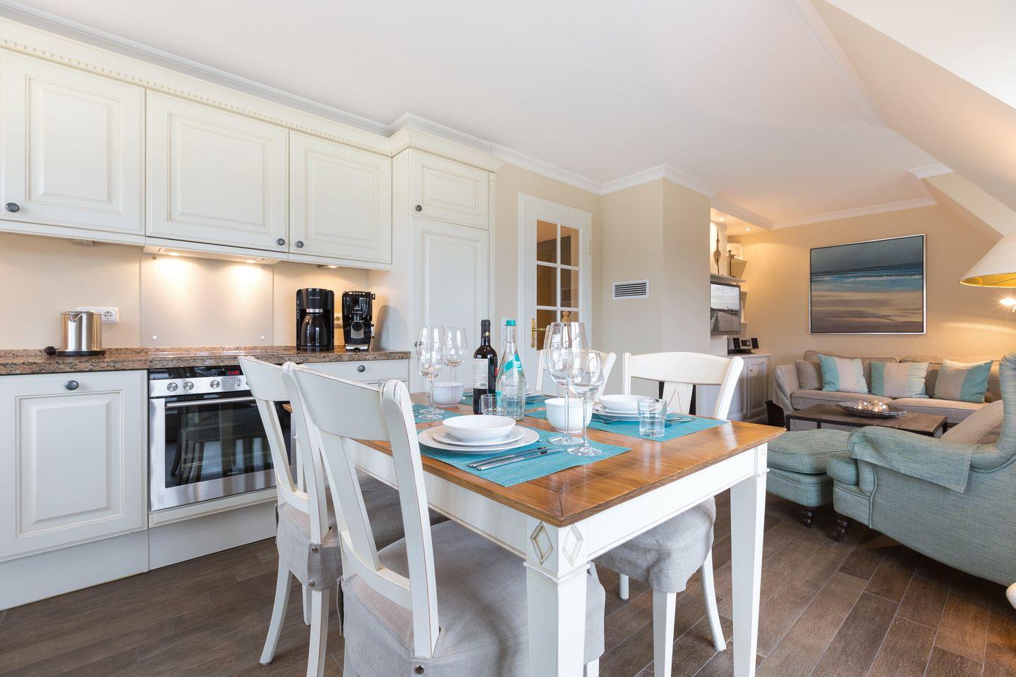 OG: Wohnraum mit Flatscreen-TV, DVD-Player, iPod Dockingstation, Hifi-Anlage, CD-Player und Radio, offener Kamin, Essbereich für vier Personen, integrierte Küche mit Geschirrspülmaschine, Backofen, Kaffeemaschine und Wasserkocher, Schlafzimmer mit Doppelbett (180x200cm) und Flatscreen-TV, Wohlfühlbad mit Dusche und WC, Waschmaschine und Trockner, Süd-Balkon mit kleiner Sitzgruppe und kl. Strandkorb (möbliert ca. von April-Oktober)
