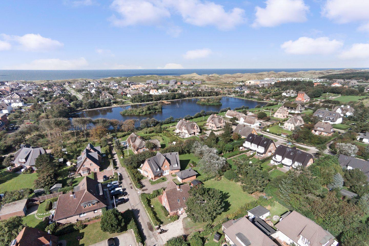 Durch ihre großartige Lage am Wenningstedter Dorfteich überzeugt diese Ferienwohnung sowohl bei Insel-Erkundlern als auch bei Ruhesuchenden. Von hier aus erreichen Sie in wenigen Autominuten die Westerländer Innenstadt, in der Sie ausgiebig Sylt-Erinnerungen shoppen können. Ein besonderes Erlebnis ist außerdem ein Spaziergang entlang der Braderuper Heide, die Sie ebenfalls in wenigen Minuten mit dem Auto oder zu Fuß erreichen können.