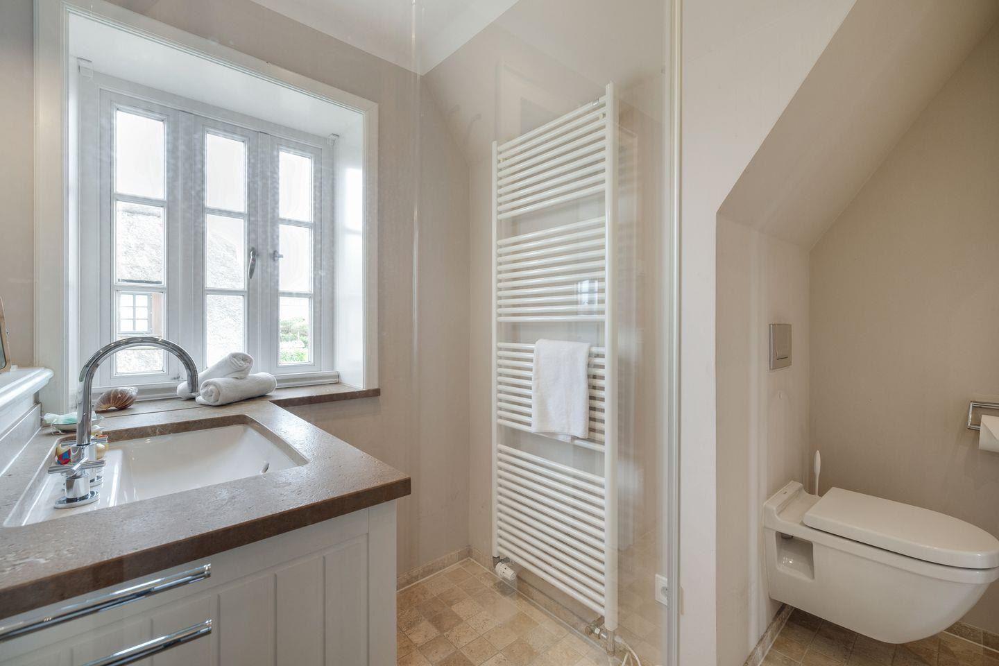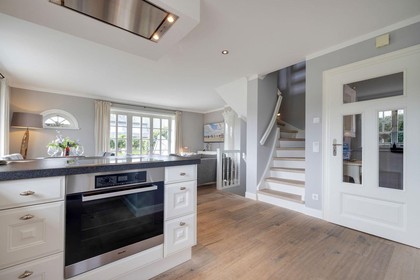 Freuen Sie sich auf dieses Entrée: luftig und sonnig empfängt Sie Ihr Erdgeschossbereich. Die edlen, gekalkten Eichendielen umschmeicheln Ihre Füße und schaffen eine fantastische Wohlfühlatmosphäre. Ihr schöner Eichen-Esstisch ist das Herz Ihres feinen Domizils. Mit der in den Raumbereich integrierten, eindrucksvollen Küche würde bestimmt auch ein sternedekorierter Spitzenkoch vorlieb nehmen. Backofen und Geschirrspüler verstehen sich von selbst. Ihr kuscheliger Wohnbereich lässt Sie Ihren Smart-TV genießen. Ihr antiker Mylin-Kachelofen verströmt Sylter Heimeligkeit pur. WLAN und ein Telefon stehen Ihnen selbstverständlich zur Verfügung, wie auch ein Gäste-WC im Eingangsbereich vorhanden ist.