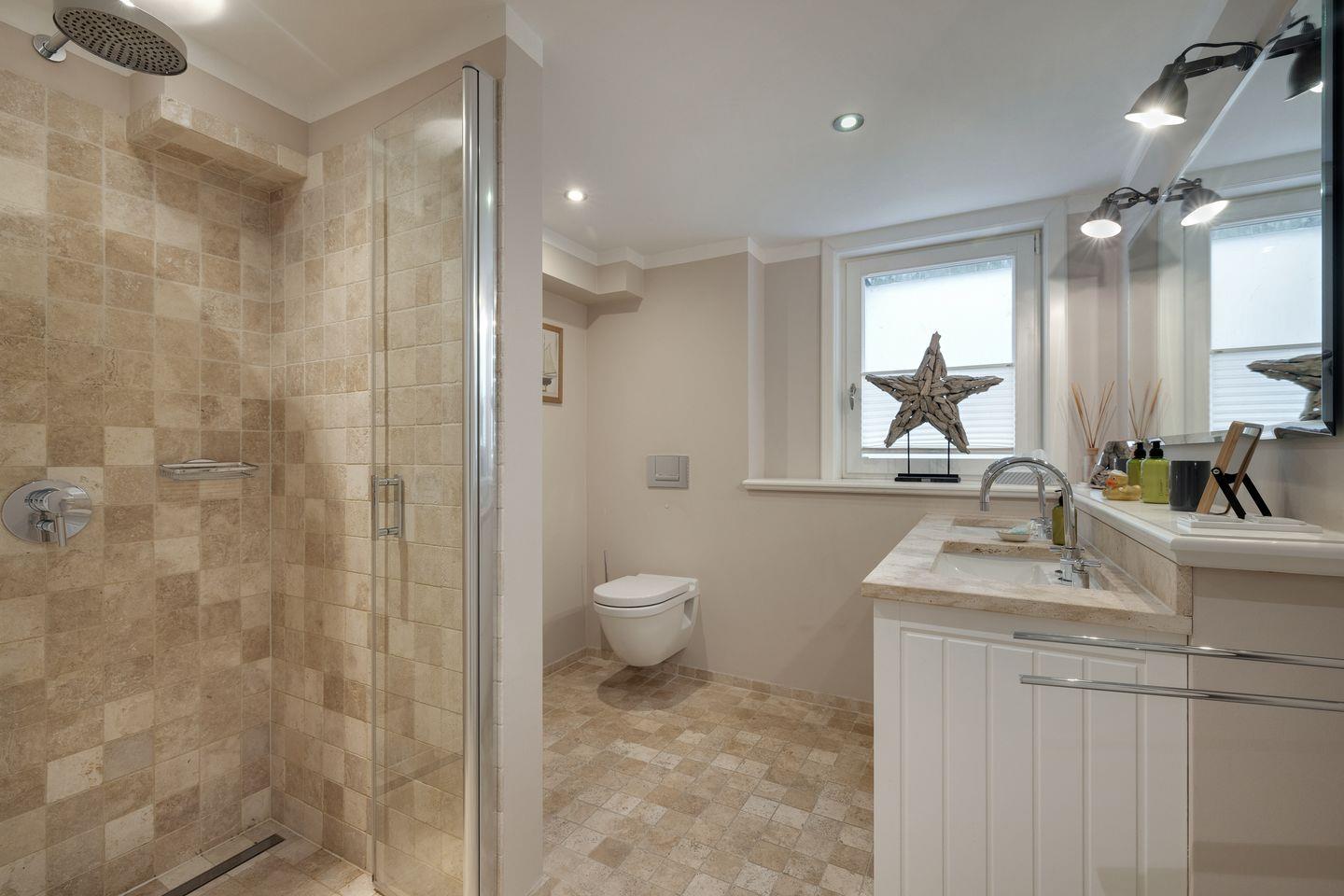 Der großzügige Bereich im Untergeschoss wird Ihnen sicherlich ein "Wow !" entlocken, finden Sie hier nochmals sehr viel Platz und eine sehr schöne Gestaltung vor. In zwei wertig dekorierten Räumen steht Ihnen je ein Doppelbett zur Verfügung (160x200cm). Ihr Bad ist großzügig und wertig mit Naturstein verarbeitet. Neben einem Doppelwaschtisch finden Sie hier noch eine schöne Dusche vor.