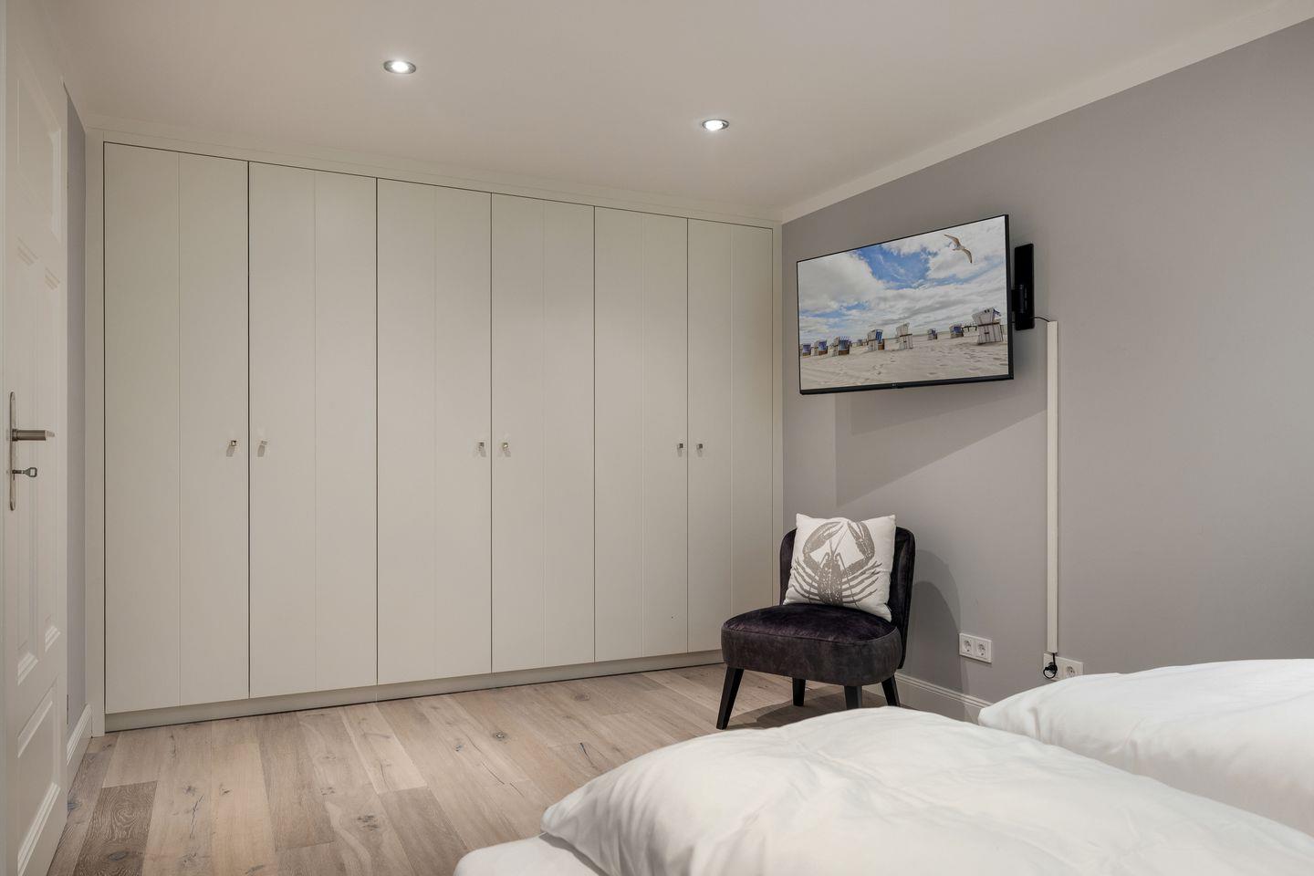 Ihr Masterbedroom ist wunderschön: alles ist hell und leicht, Ihnen steht viel Raum für sich und Ihre Kleider zur Verfügung. Sofern "kompakterer" Nachwuchs mit Ihnen reist, kann dieser ideal um die Ecke im gleichen Raume in einem Einzelbett (90x200cm) nächtigen. Ihr Doppelbett (160 x200cm) lässt Sie traumhaft schlafen. Gleich um die Ecke empfängt Sie ein sehr schönes Bad mit Dusche und WC.