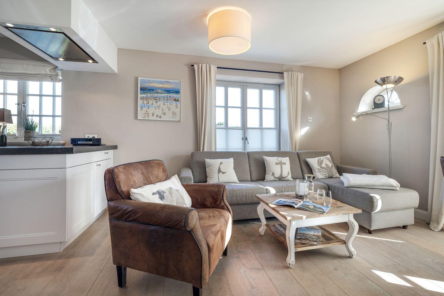 Doch nicht nur die Lage und das Open Air Ihres Logis sind topp, auch die inneren Werte Ihres Sylt-Hues überzeugen auf höchstem Niveau. Die gekalkten Eichendielen verströmen Eleganz und Wohlfühlatmosphäre pur. Ihre eindrucksvolle Küche ist Luxus pur.[nbsp][nbsp]Bei der Möblierung wurde Wert auf Stil, Wertigkeit aber auch Leichtigkeit gesetzt: alles verströmt eine Brise Meer, ist luftig leicht und verkörpert Sylt pur. Luxus: ja. Verstaubt: definitiv nein.