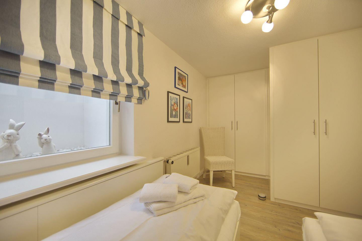 UG: 1 Raum mit Doppelbett (180x200cm) sowie 1 Raum mit 2 Betten (80x200cm). Dusche/WC. Sehr schöne Süd-Terrasse mit Strandkorb (ca. von April-Oktober).