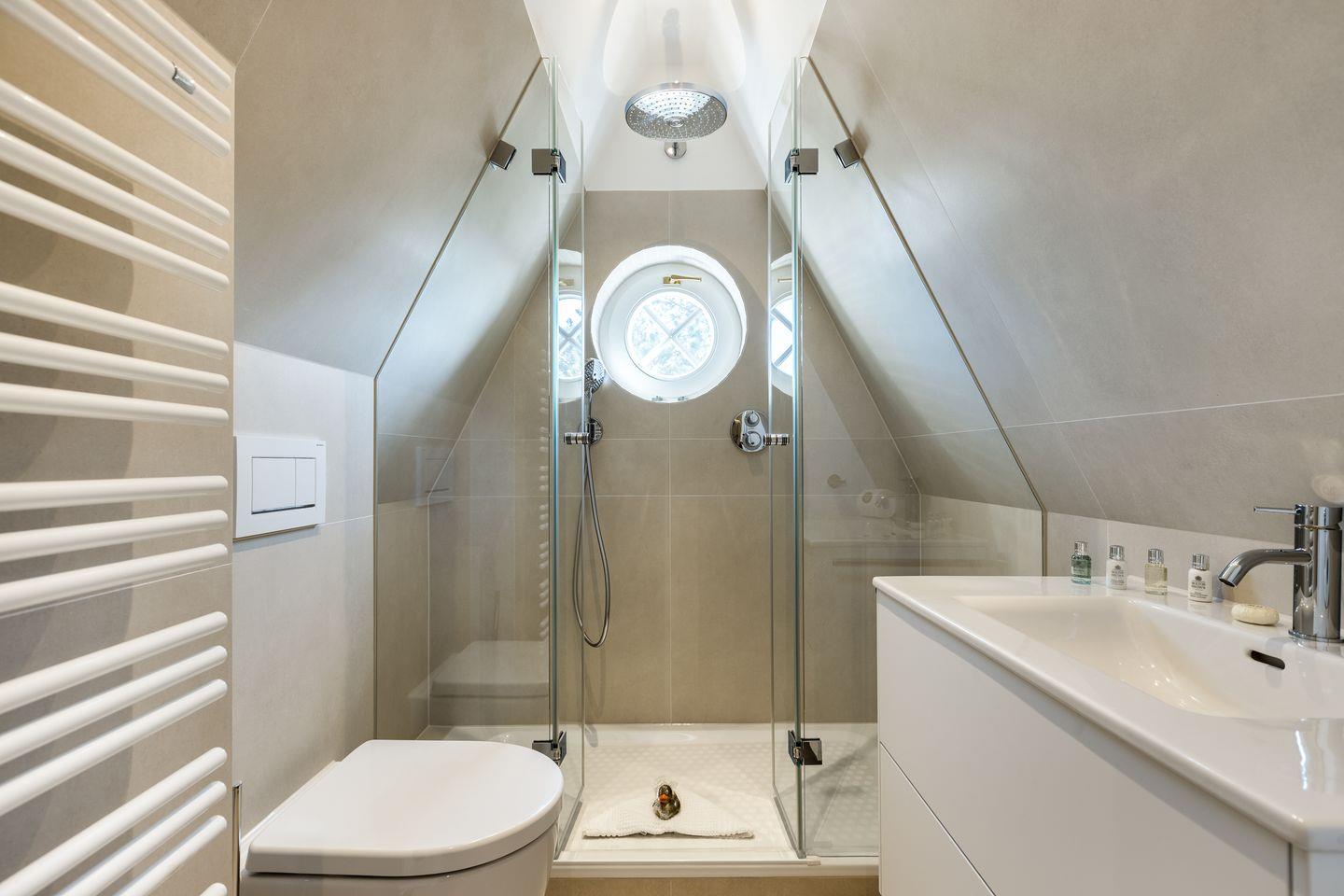 DG: Raum mit Boxspring Bett (ca. 1,8m x 2m) und sogar kleinem Dünen- und Meerblick. Kleines Bad mit Dusche und WC.