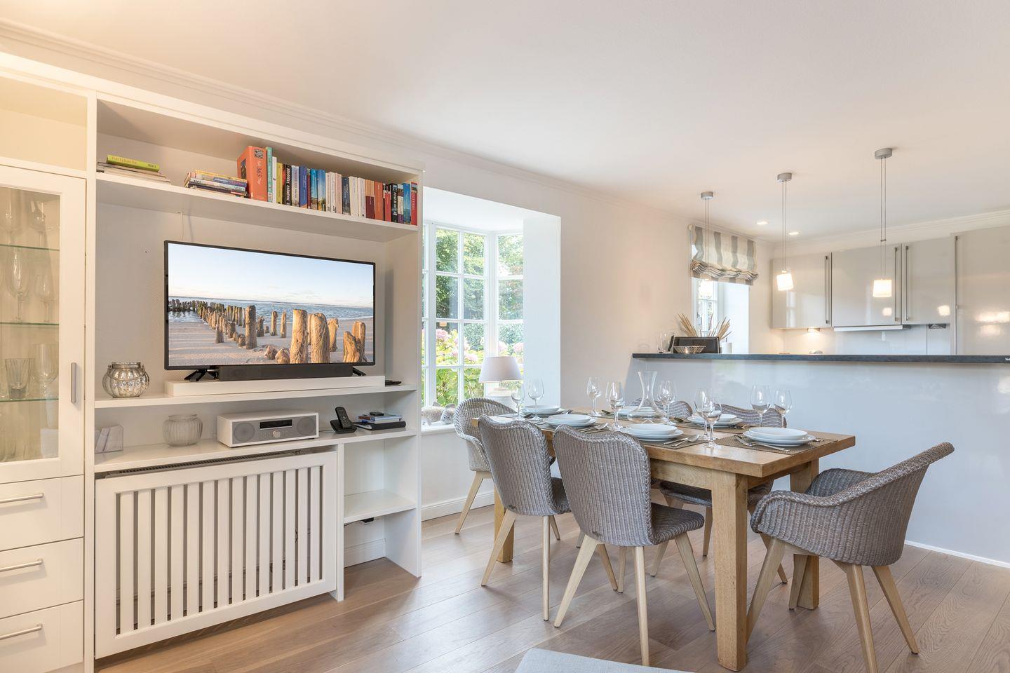 EG: Großzügiger, heller Wohnraum mit edlen Eichendielen und Flatscreen-TV. Integrierte Luxusküche mit Backofen und Geschirrspüler, Airfryer Cosori Turbo Pro und Jura Kaffeemaschine. Essbereich mit Kinderhochstuhl. Gäste-WC. Schöne Terrassensituation: Frühstücken Sie mit der Morgensonne und genießen Sie Ihr eigenes Grundstück auf der nach Westen umlaufenden Terrasse. Wertige Gartenmöbel und Strandkorb (ca. von April–Oktober).