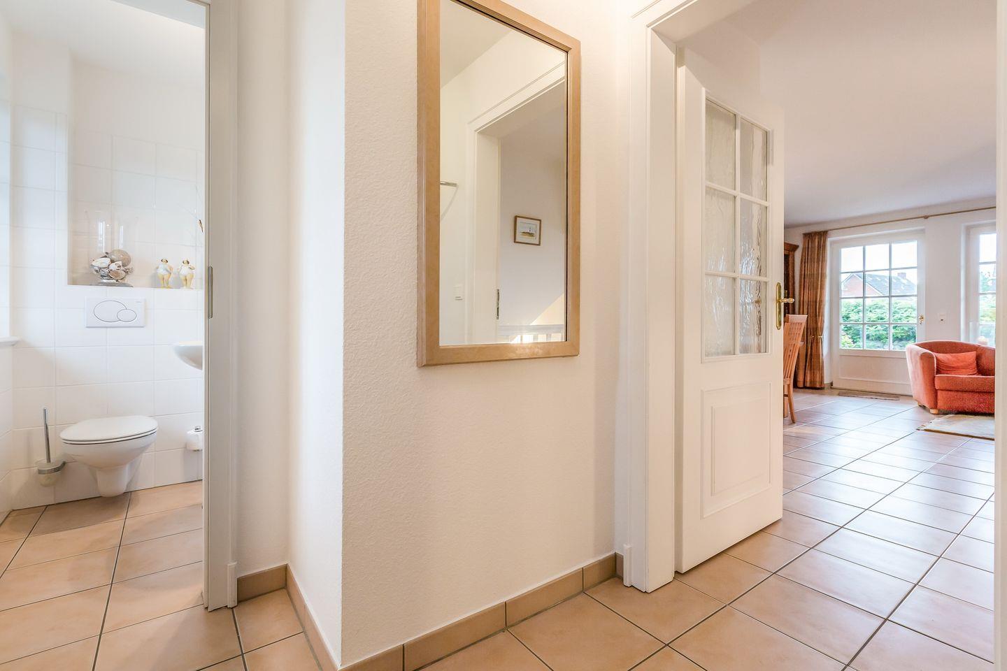 Erdgeschoss: Geschmackvoll und hochwertige möblierter Wohnraum mit Smart-TV, Hifi-Anlage inklusive Bose SoundLink (mit Bluetooth) und Telefon. Luxuriöse Küche mit Geschirrspüler, Mikrowellen-Backofen-Kombination. Gäste-WC. Sonnige West-Terrasse mit Gartenmöbeln und Strandkorb.