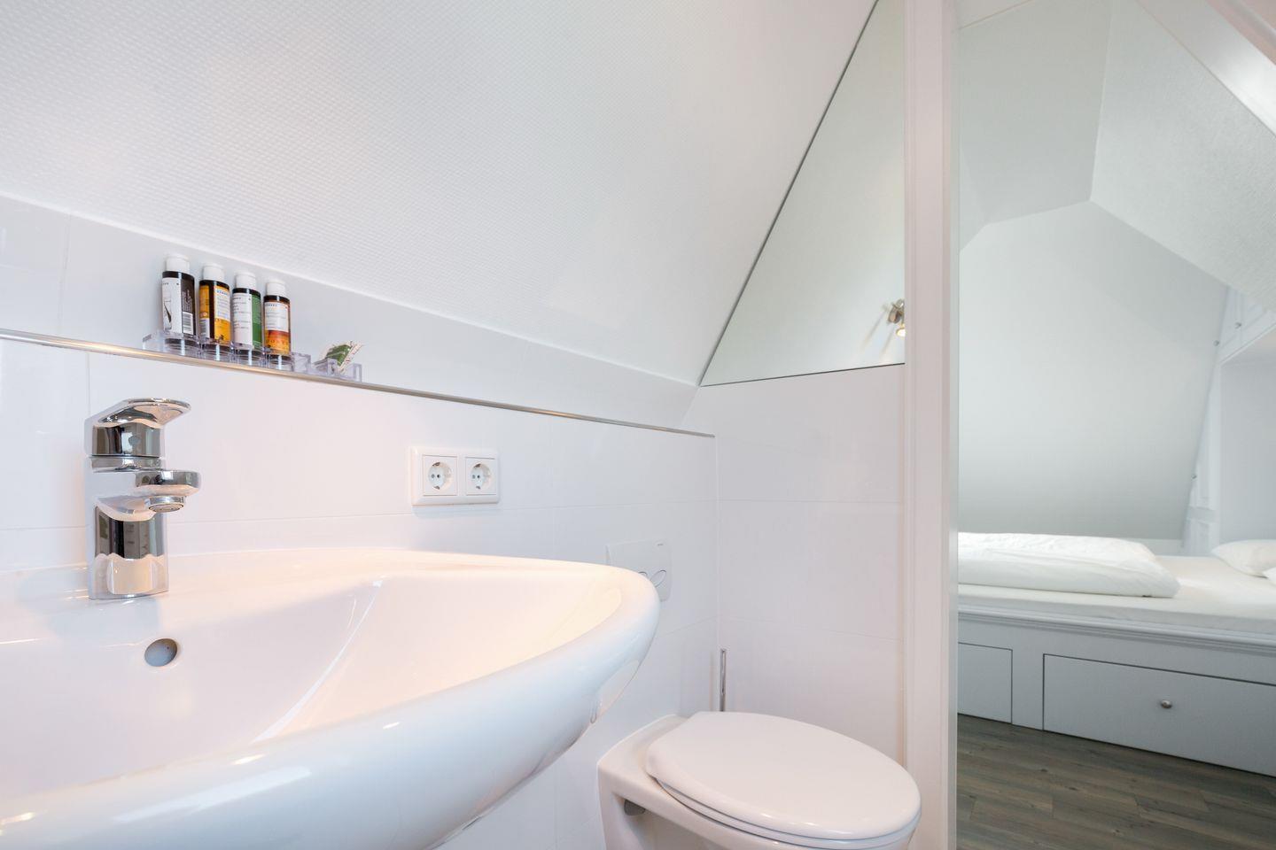 Im Dachgeschoss erwartet Sie ein wertig gestalteter Raum mit Doppelbett (180x200cm) und viel Schrankplatz. Es steht Ihnen ein weiteres En-Suite Bad zur Verfügung, hier sogar mit Wanne sowie WC.