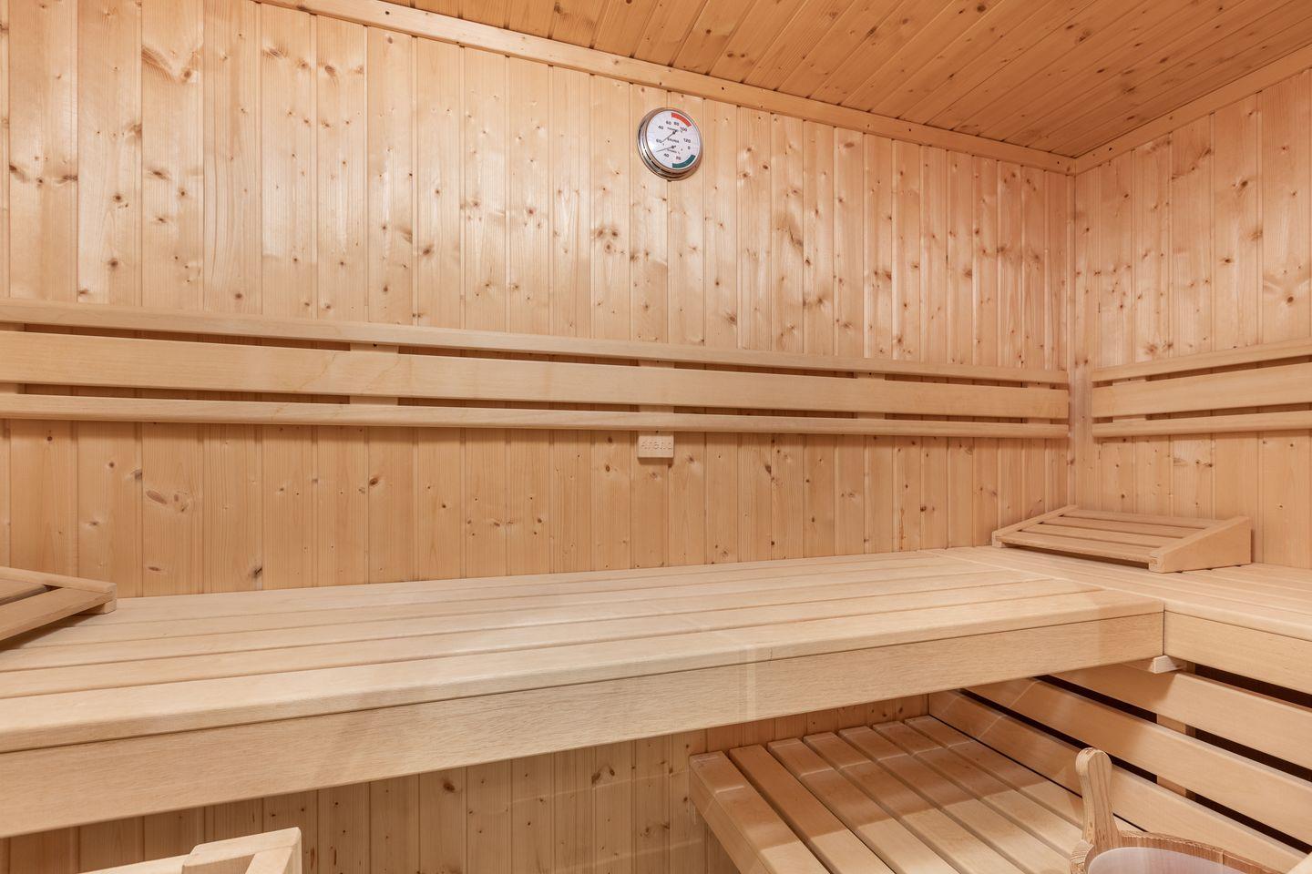 Und nicht, dass das bereits alles in Sachen Wellness wäre: als Highlight dürfen Sie sich ebenfalls noch auf einen Wellness-Saunabereich freuen. Eine kleine Ruhezone sowie eine XXL-Dusche, sogar mit Schwallfunktion ausgestattet, runden den Mini-Spa Bereich ab.