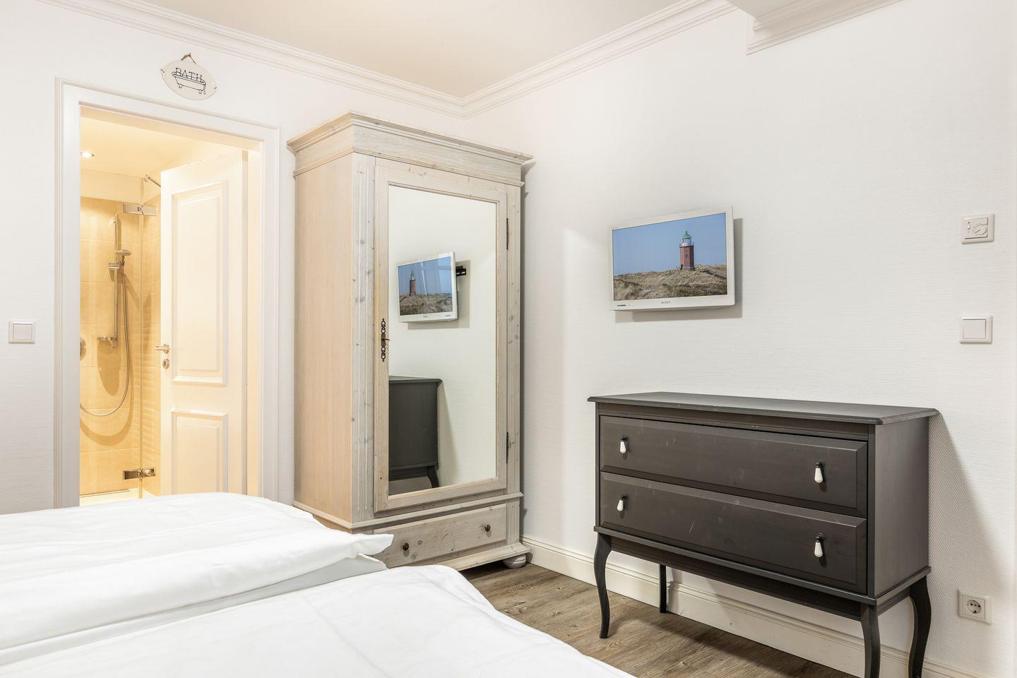 Ihre kleine, aber sehr feine und überkomplett ausgestattete Küche mit Geschirrspüler und Backofen lässt Herzen selbst ambitionierter Hobbyköche höher schlagen. Weiterhin finden Sie im Erdgeschoss ein sehr schön gestaltetes Schlafzimmer mit Doppelbett (1,8x2m), Wand-/Unterputzradio und Flat-TV. Ihr Wellness-En-Suite Bad mit XL-Dusche und WC lässt Sie beschwingt in den Tag kommen oder stilvoll Ihren Sylter Urlaubstag beschließen. Natürlich darf auch ein Gäste-WC im Entrée nicht fehlen.