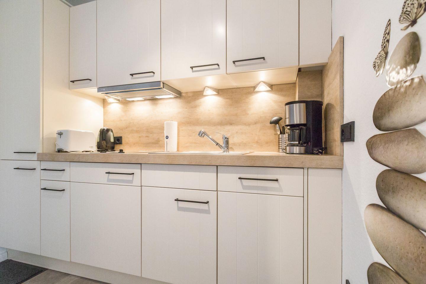 Im Eingangsbereich neue Küchenzeile mit Geschirrspüler, Ceranfeld und Espressomaschine.