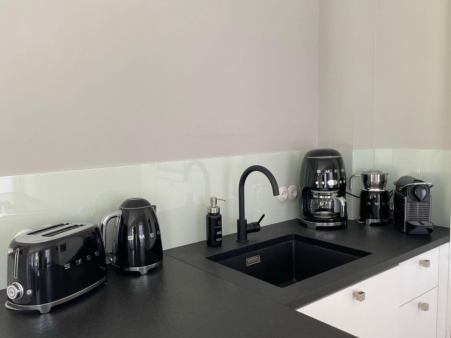 Die offene Küche präsentiert sich in dezent in Weiß mit einer Arbeitsplatte aus grauem Granit und ist selbstverständlich