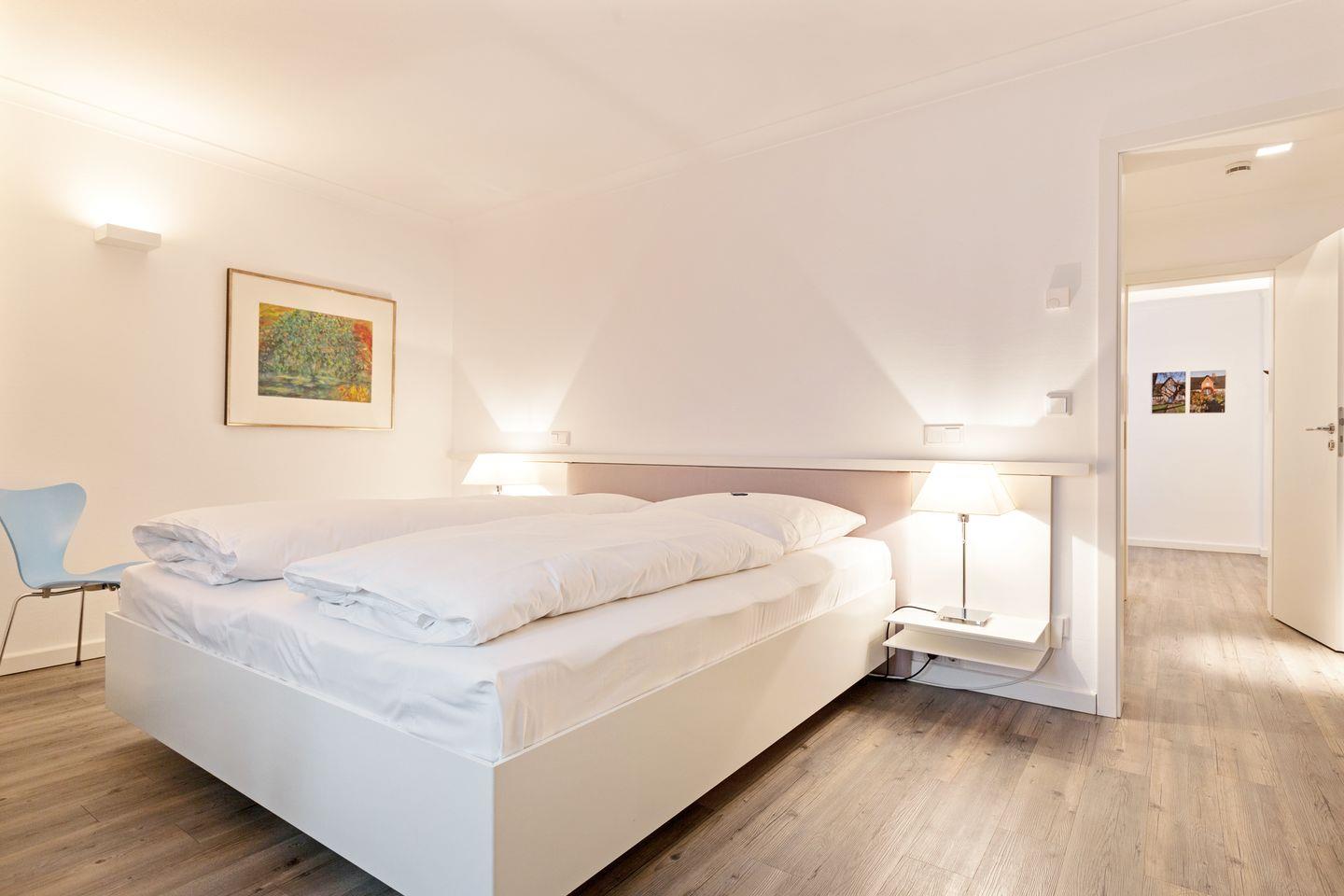Im[nbsp][nbsp]Erdgeschoss befindet sich ferner für Sie ein sehr schönes Schlafzimmer mit einem Doppelbett (ca. 1,6x2m) . Dieser Raum kann Ihnen tagsüber auch perfekt als Rückzugsort dienen. In Ihrem USM-Haller Regal stehen Ihnen lesenswerte Bücher zur Verfügung. Vis-a-vis dieses Zimmers befindet sich ein feines, luxuriöses Bad mit großer Dusche, beheiztem Handtuchhalter und WC.