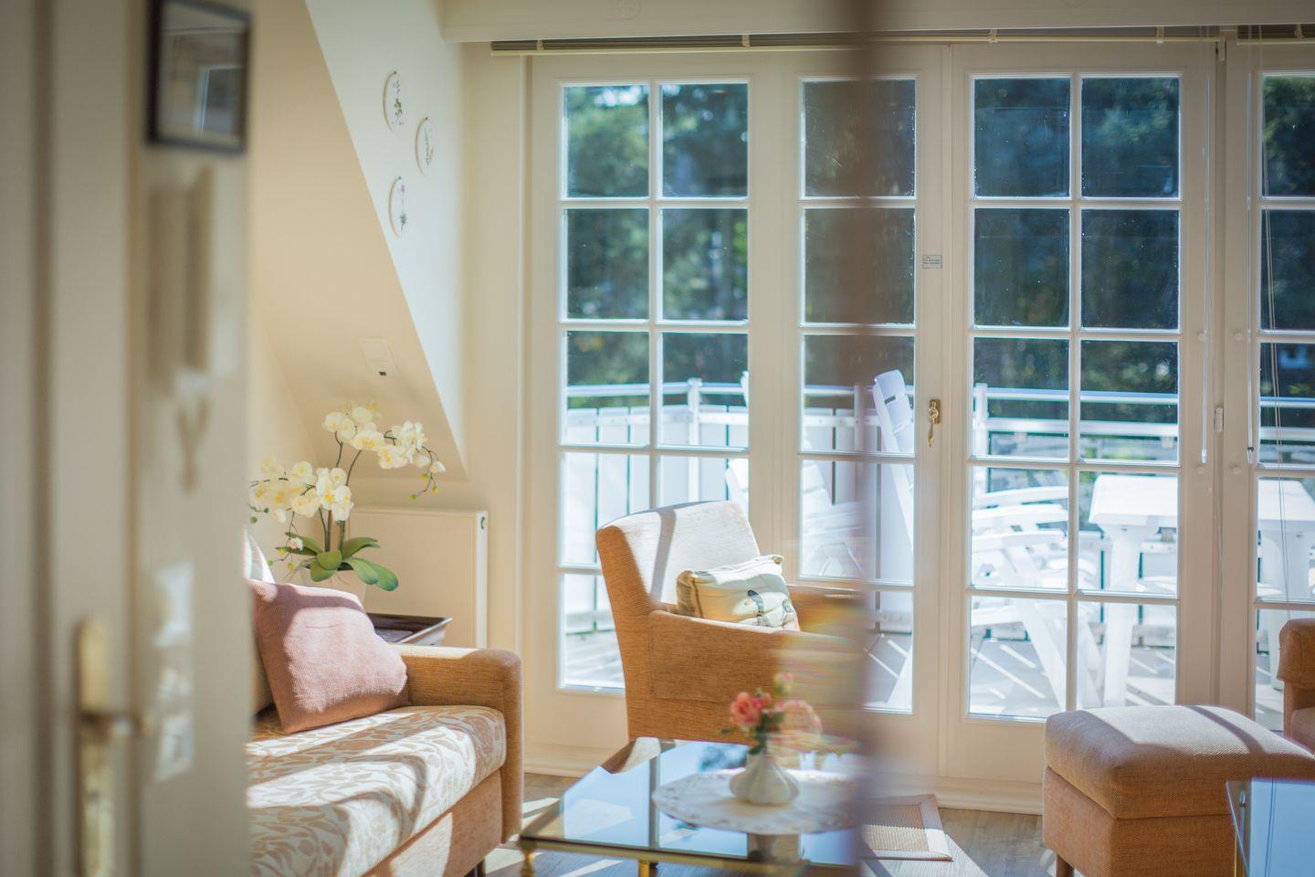 OG: Sehr geschmackvoll und hochwertig eingerichteter, heller Wohnraum mit Flat-TV, Hifi-Anlage und Telefon. Gemütliche Sitzecke. Optisch durch hochwertige Tischlerarbeiten getrennte Küche mit Geschirrspüler und Backofen-Microwellenkombination. Safe. Wohlfühlbad mit Dusche und WC sowie Waschmaschine und Trockner. Sehr schöner, großzügiger Süd-Balkon mit Gartenmöbeln (ca. von April - Oktober).