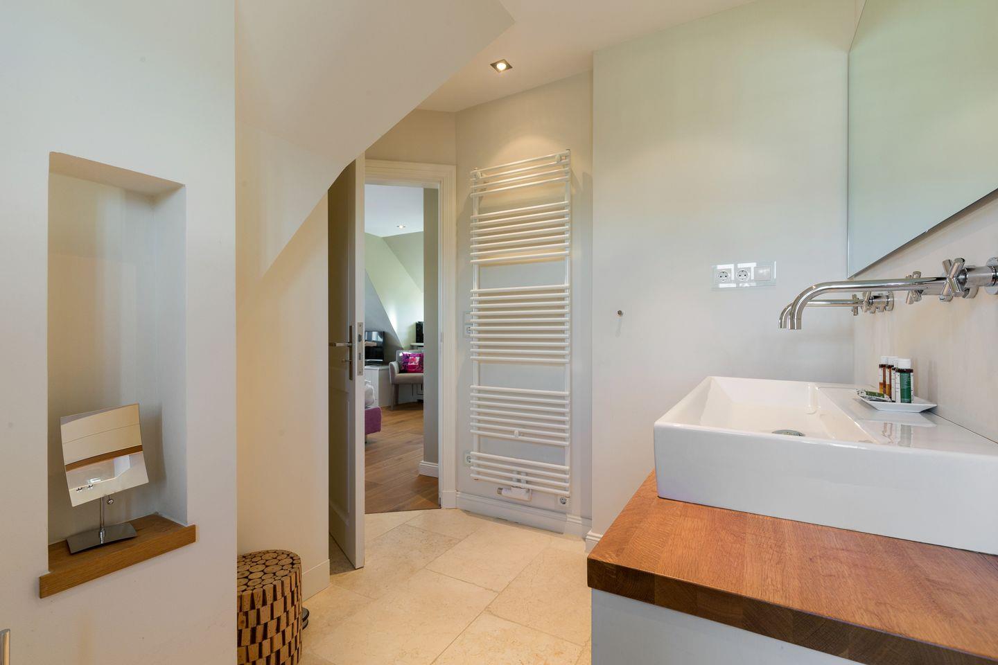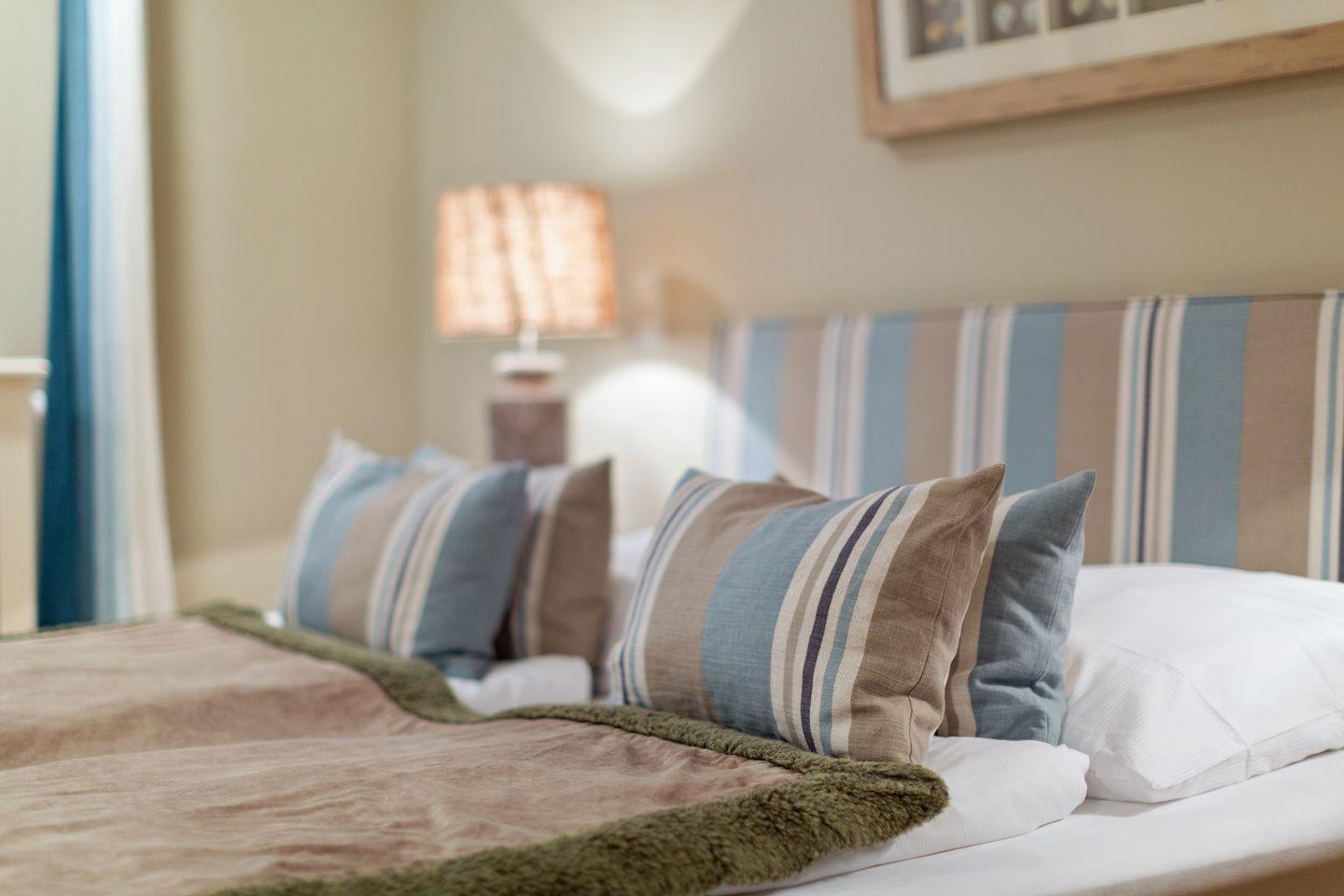 Im Obergeschoss finden Sie einen äußerst geschmackvoll designten Masterbedroom mit Flat-TV vor. Ihr Doppelbett (ca. 2x2m) sorgt für traumhaften Schlaf. Benachbart finden Sie ein weiteres Schlafzimmer mit eingebautem Doppelbett und Flat-TV vor (ca. 1,4x2m, durch den Erkereinbau verjüngt sich das Bett leicht). Sehr schönes En-Suite Bad mit großer Dusche, WC und feinem Waschtisch.