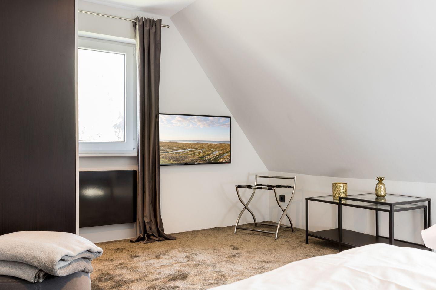 Masterbedroom mit Doppelbett (180x200cm) und TV. Sehr schönes Design-Bad mit Dusche und WC. Ein kleinerer Raum mit Schlafsessel (90x200cm).