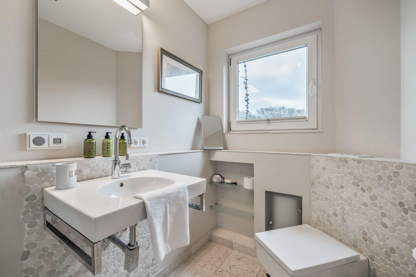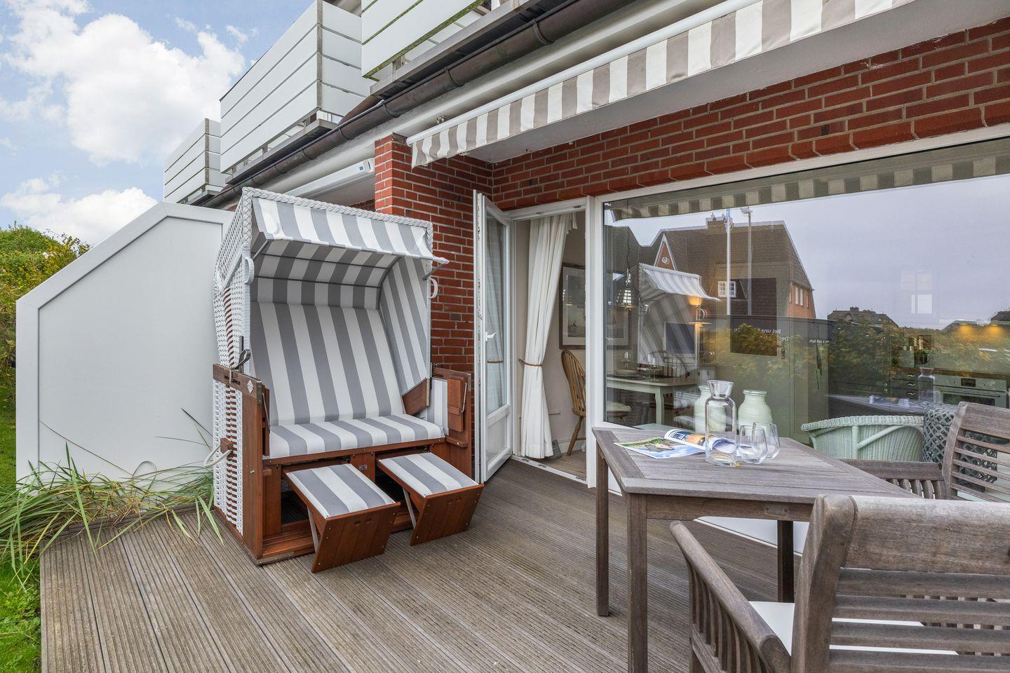 Und was lässt hier sonst noch Ihr Inselherz höherschlagen ? Haben Sie bereits das traumhafte Wohlfühlbad im Beach-Design entdeckt ? Die Sylter Sonne scheint ? Nichts wie raus auf Ihre großzügige und wertige Holz-Design-Terrasse, die mit schönem Gartenmobiliar die Sonne durch Ihre Süd-/Ostausrichtung auch maximal genießen lässt. Durch die "Eck-Lage" Ihres Appartements erleben Sie Ihren Open-Air Bereich "gefühlt" noch großzügiger. Dieses garantiert Ihnen ebenfalls ein Mehr an Privatssphäre und Licht - u.a. perfekt für Ihr Terrassen-Frühstück, durch die Morgensonne.