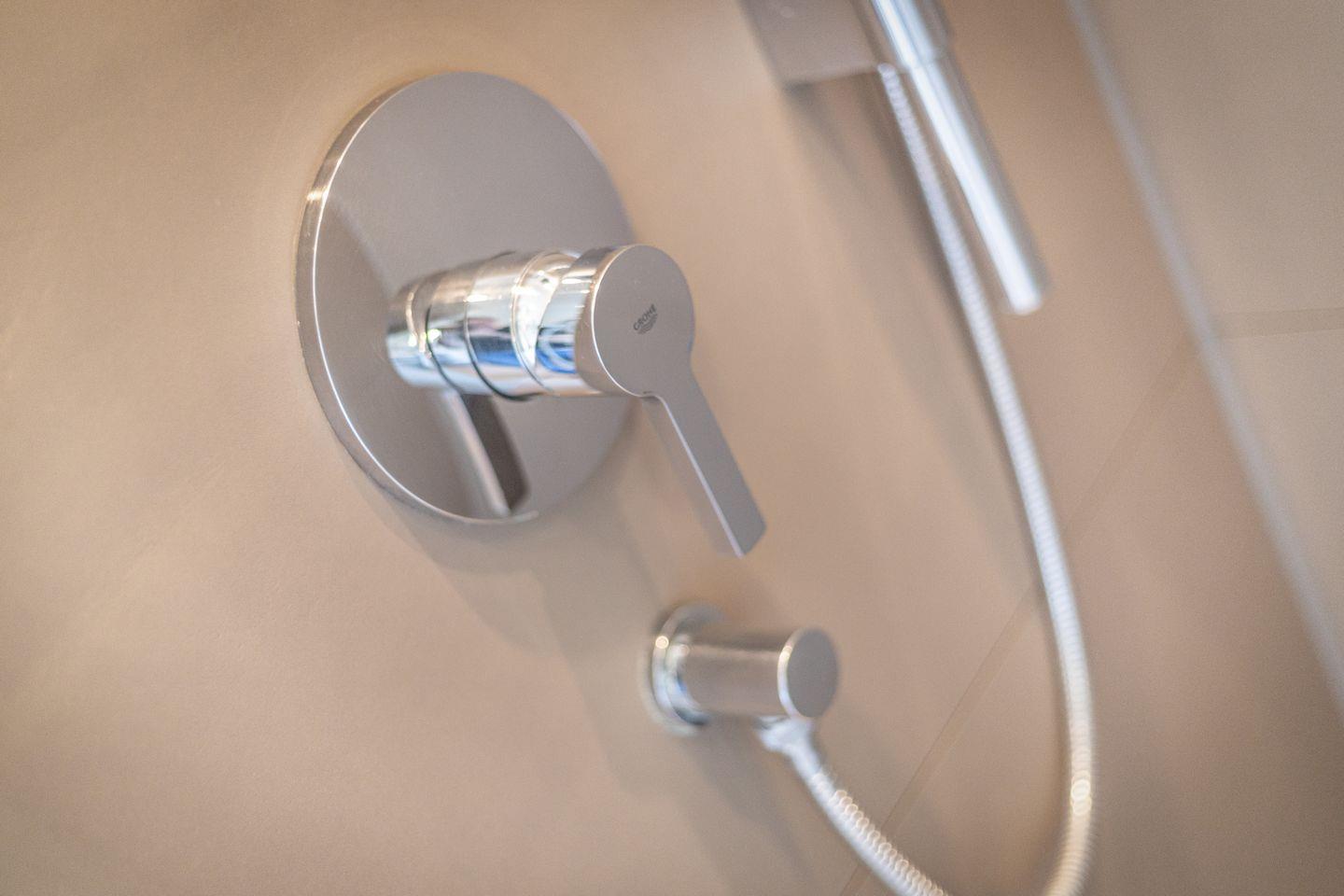Auf gleicher Ebene finden Sie ein Schlafzimmer mit Doppelbett und Flatscreen-TV sowie ein großzügiges Tageslichtbadezimmer mit Badewanne, Dusche und WC. Eine Waschmaschine steht Ihnen hier ebenfalls zur Verfügung. Im Untergeschoss des Hauses befindet sich eine Gemeinschaftssauna.