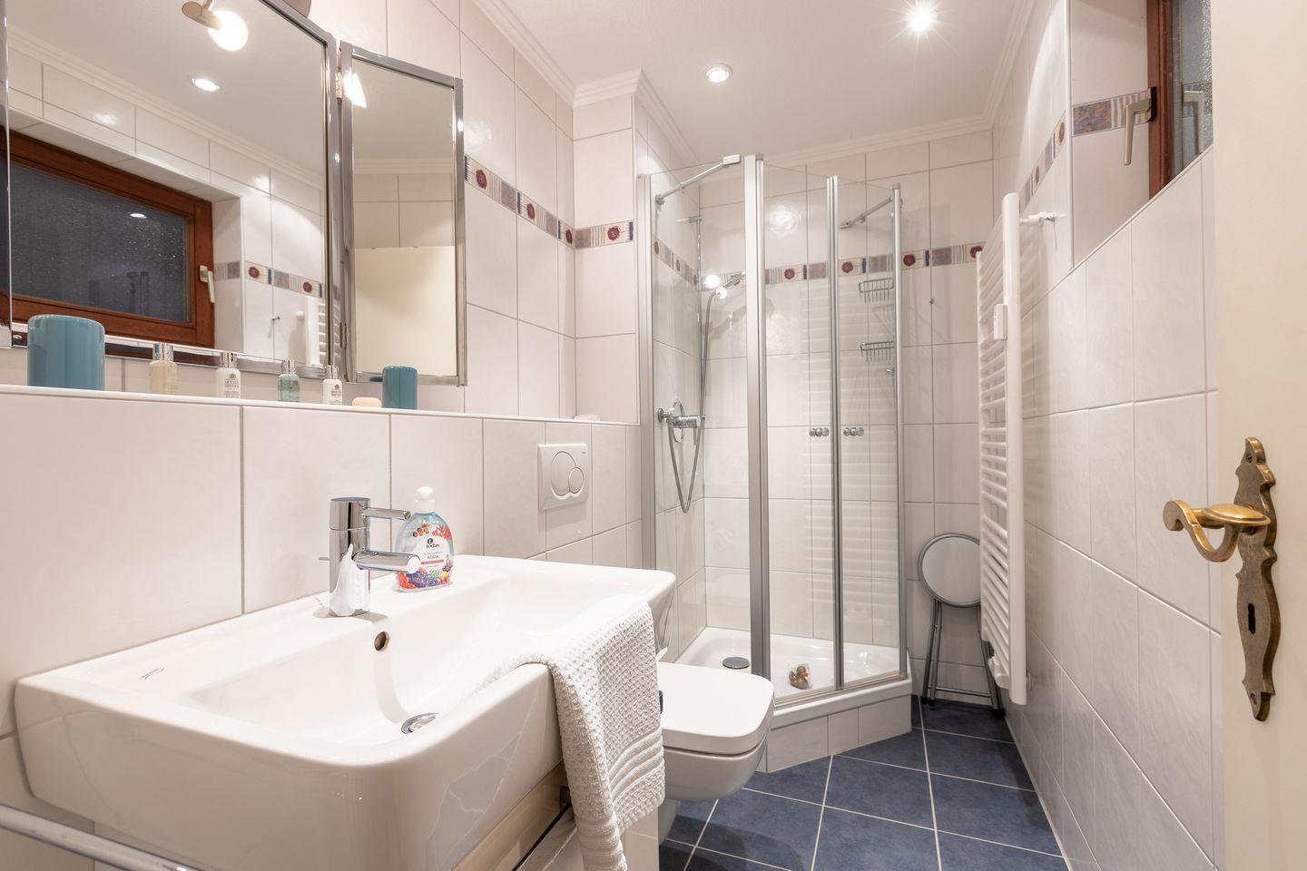 Badezimmer mit Dusche und WC. Ein Schlafraum mit Doppelbett (180x200cm). Terrasse mit Gartenmöbel (ca. April - Oktober)