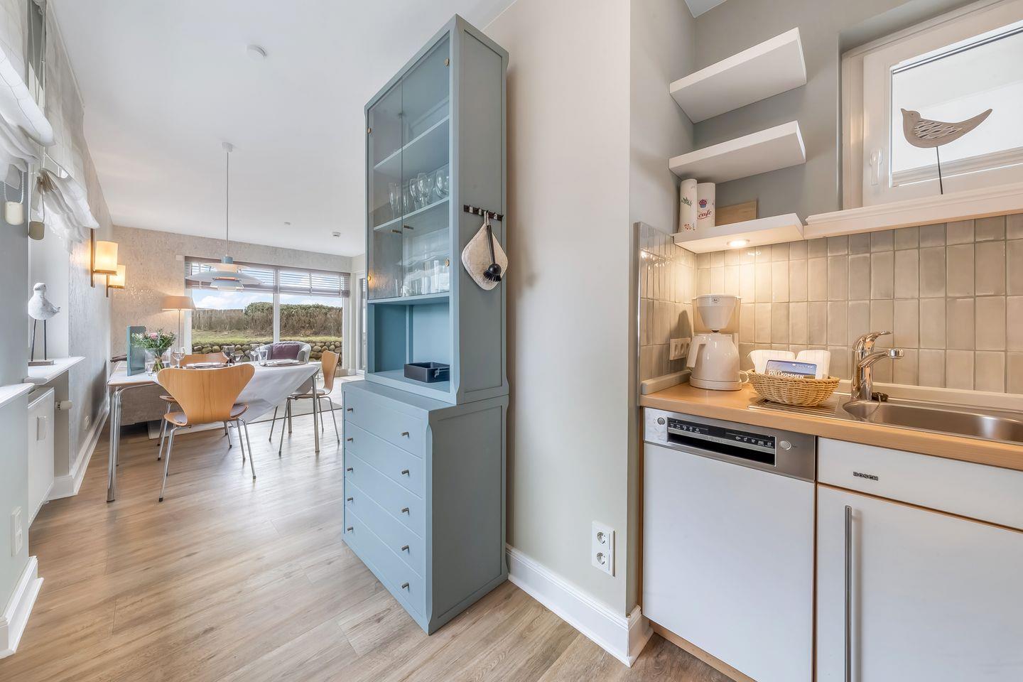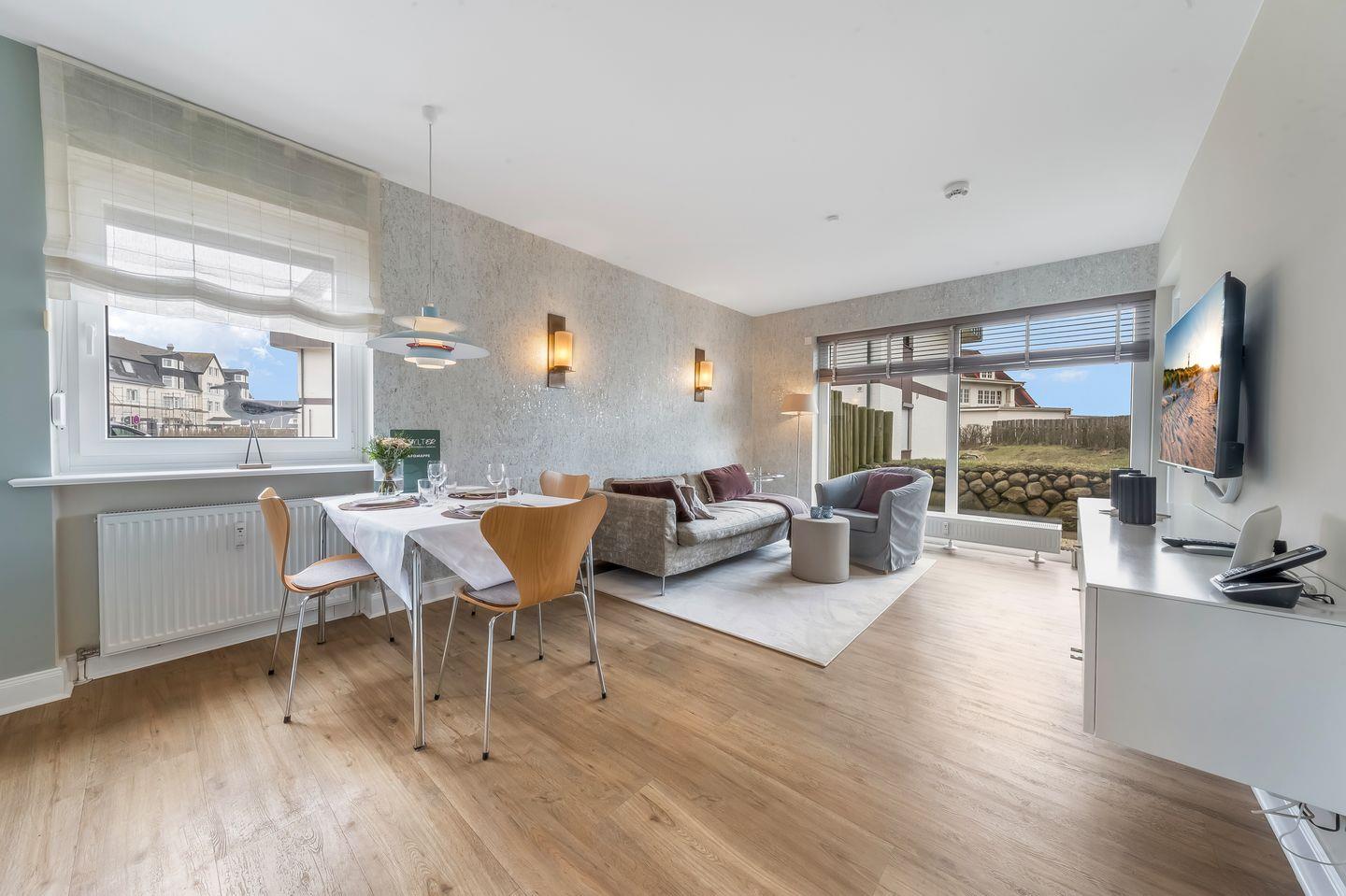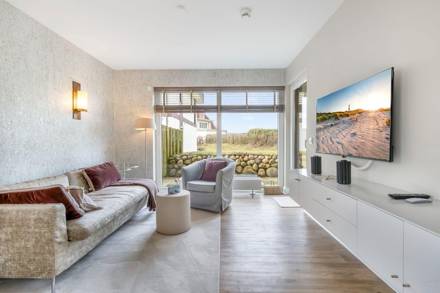 Von hier gelangen Sie auf die großzügige und neu möblierte West-Terrasse mit eigenem Saisonstrandkorb (ca. April bis Oktober) und können dem Meeresrauschen der Nordsee lauschen.