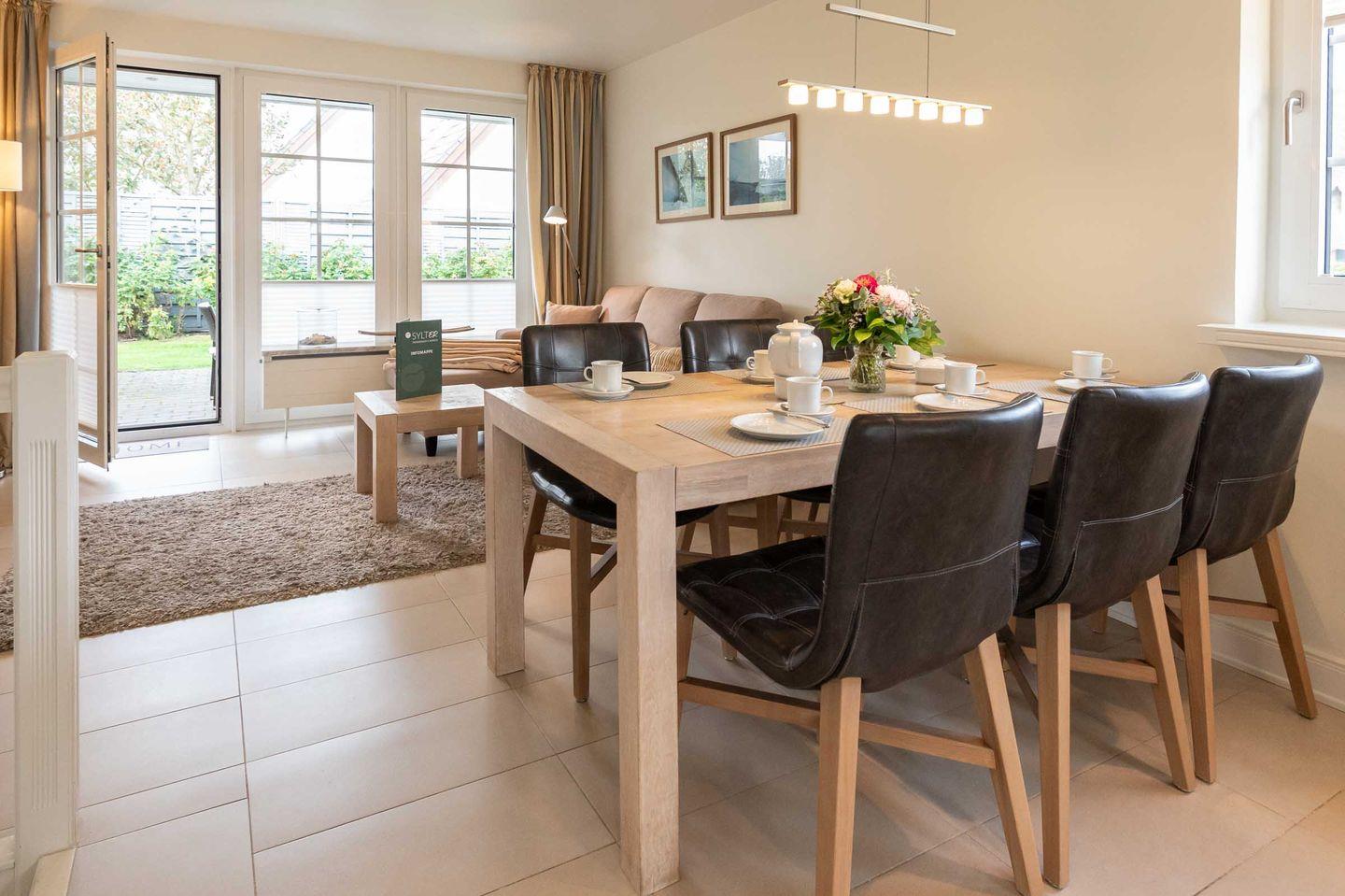 Großzügiger Essbereich mit fließendem Übergang zur gemütlichen Sofaecke mit Sessel, TV und Blick auf die Terrasse und in den ruhigen Garten.