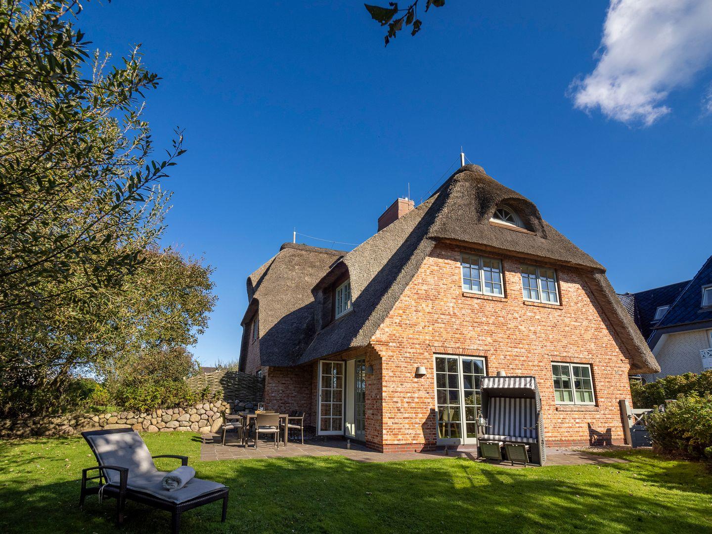 Luxusanwesen auf Sylt in ruhiger Lage bietet den vollen Urlaubskomfort unter Reet für 5 Personen. Hausteil mit Garten und Südwest-Terrasse.