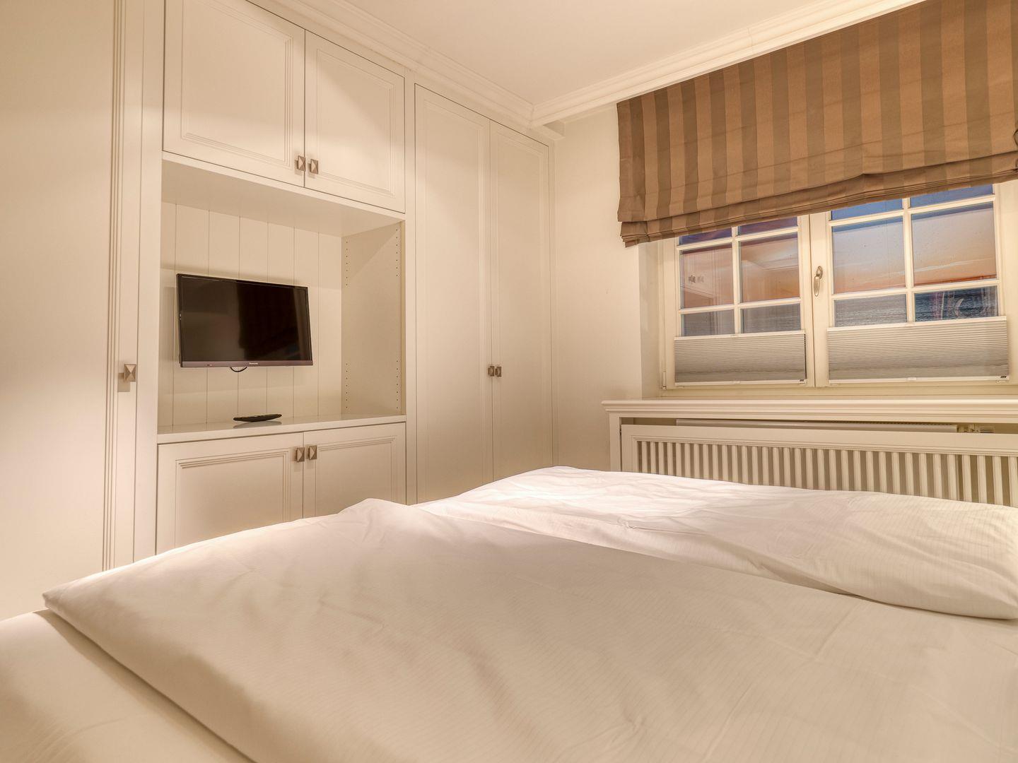 Schlafzimmer 1: Boxspringbett, Einbauschränke, TV und Fenster. Ein kleiner Schreibbereich ermöglicht mobiles Arbeiten im Urlaub.