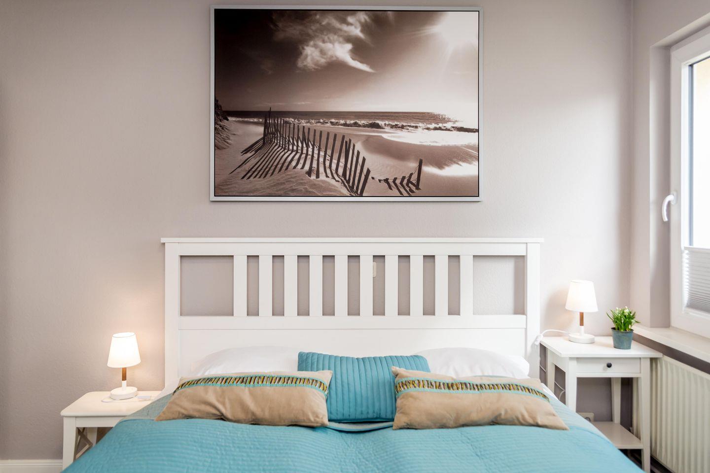 Das Schlafzimmer mit Doppelbett und großem Kleiderschrank liegt ruhig zur Rückseite des Hauses. Direkt angrenzend befindet sich ein Tageslichtbad, klar gestaltet und funktional.