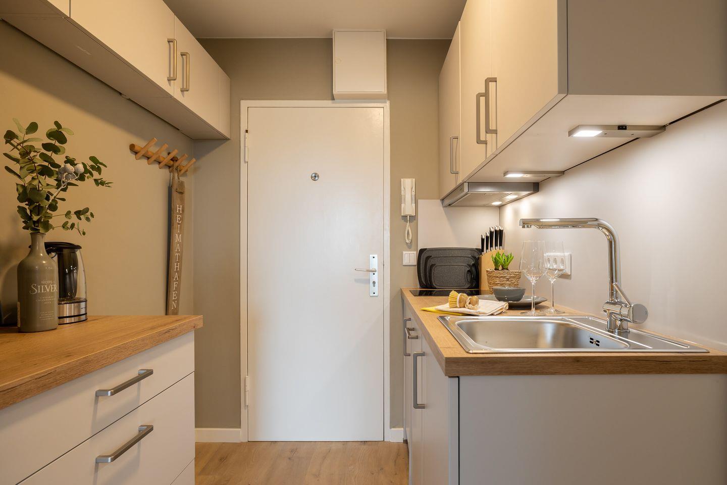 Die Kochnische ist modern ausgestattet und bietet alles, was es für eine unkomplizierte Selbstversorgung braucht. Cerankochfeld, Kühlschrank mit Gefrierfach, Spülmaschine sowie Kaffeemaschine und Wasserkocher stehen zur Verfügung.