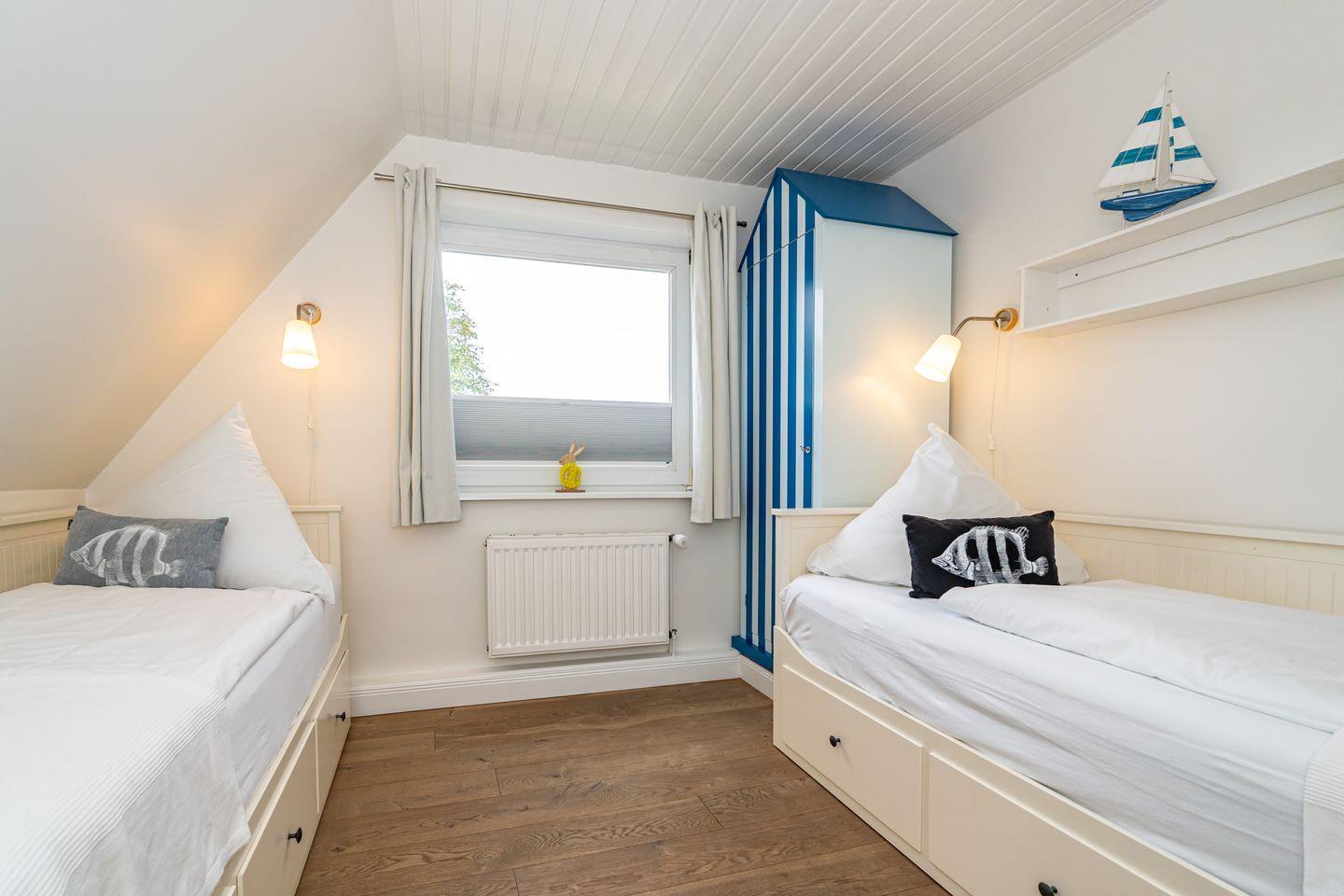 Die Ferienwohnung „Ferienliebe Strandzeit“ begrüßt Sie im beliebten Wenningstedt auf Sylt. Diese behagliche Ferienwohnung bietet Platz für bis zu vier Personen und verteilt sich über zwei Ebenen. Im ersten Obergeschoss befindet sich die Küche mit Essbereich. Hier erwartet Sie ein Mikrowellenbackofen, eine Kaffeefiltermaschine, Toaster, Wasserkocher sowie ein Geschirrspüler. Ebenfalls auf dieser Ebene befinden zwei Schlafzimmer. Eins davon mit zwei Einzelbetten, das andere mit Doppelbett, Kleiderschrank und TV. Das Tageslicht Badezimmer verfügt über eine Dusche, WC und Waschbecken. Über eine Treppe gelangen Sie in das Dachgeschoss, wo sich der Wohnbereich mit gemütlicher Couch und TV befindet. Im Gemeinschaftsvorgarten ist eine eigene Terrasse die zu der Ferienwohnung gehört. Ein Parkplatz steht Ihnen am Haus zur Verfügung.