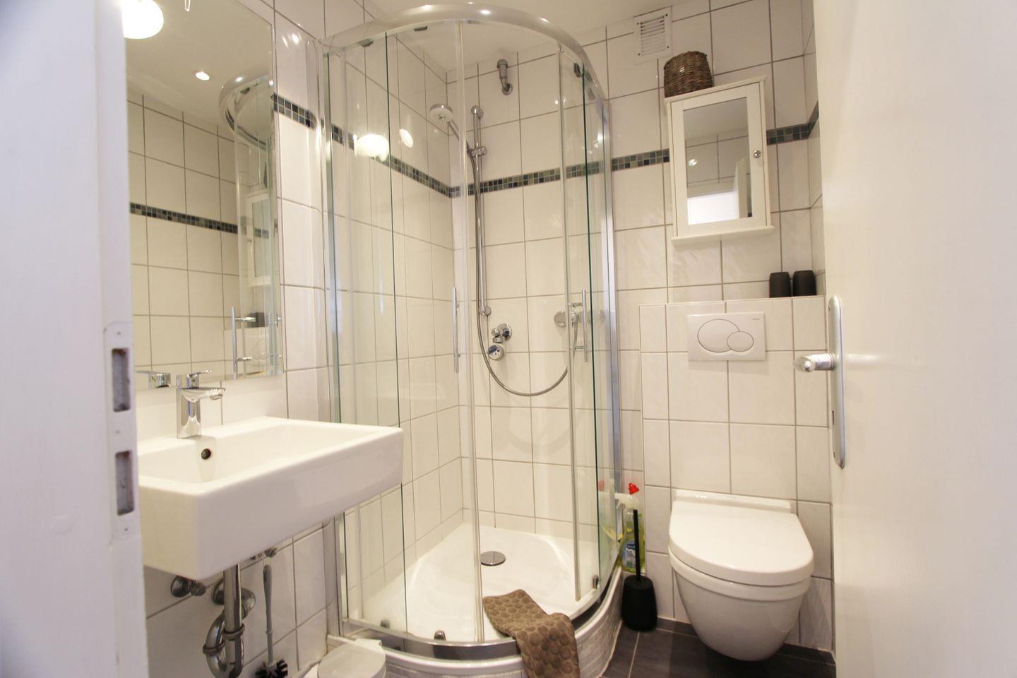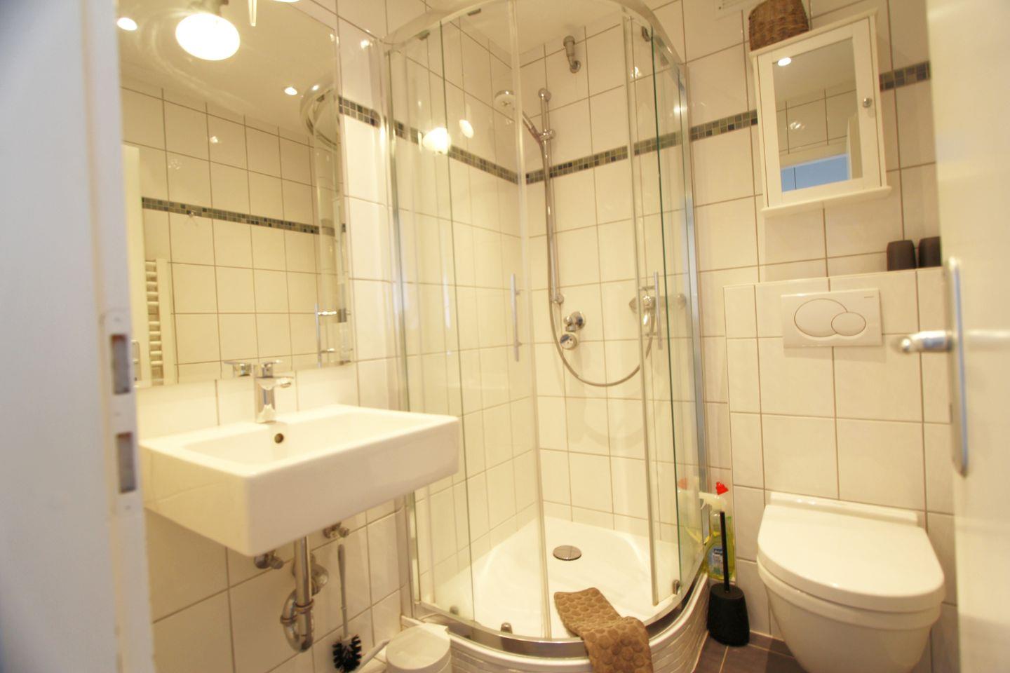 Das hell geflieste Badezimmer bietet eine Dusche und WC.