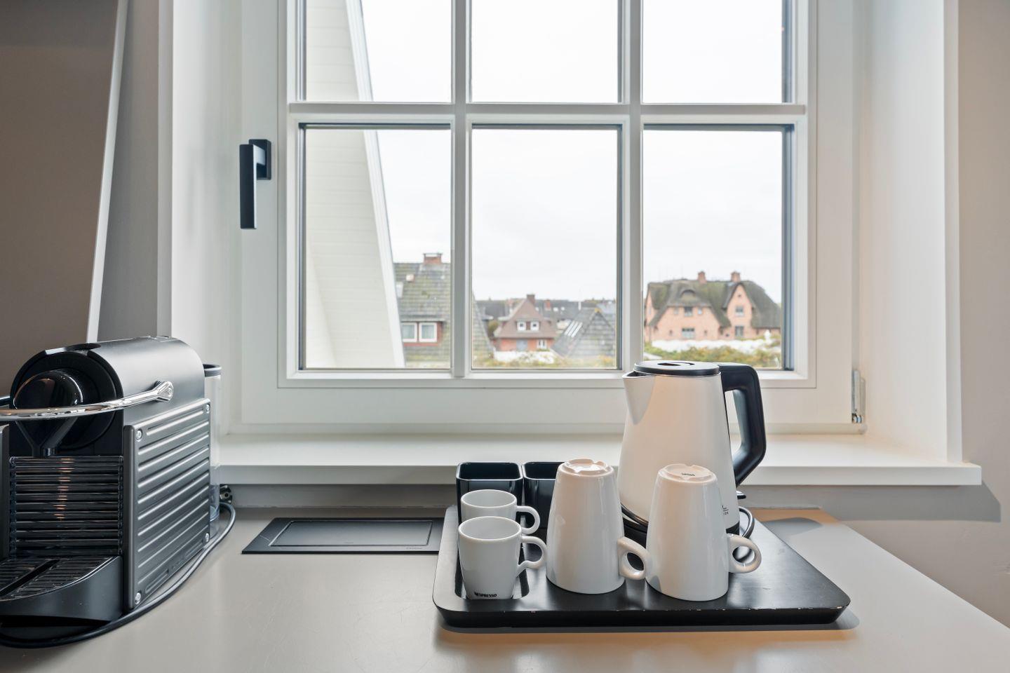 Die offene Pantry-Küche ist funktional und stilvoll ausgestattet. Mit Induktionskochfeld, Weinkühlschrank, Kühlschrank mit Gefrierfach, Nespresso-Kaffeemaschine und Geschirrspüler eignet sie sich ideal für die Zubereitung eines schnellen Frühstücks oder kleiner Snacks zwischendurch. Der angrenzende Essbereich bietet Platz für gemeinsame Mahlzeiten.
