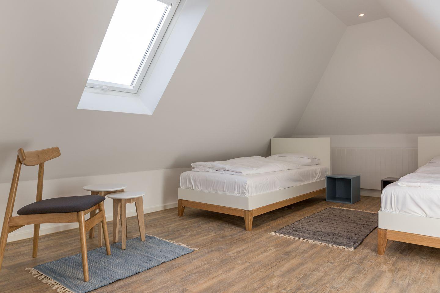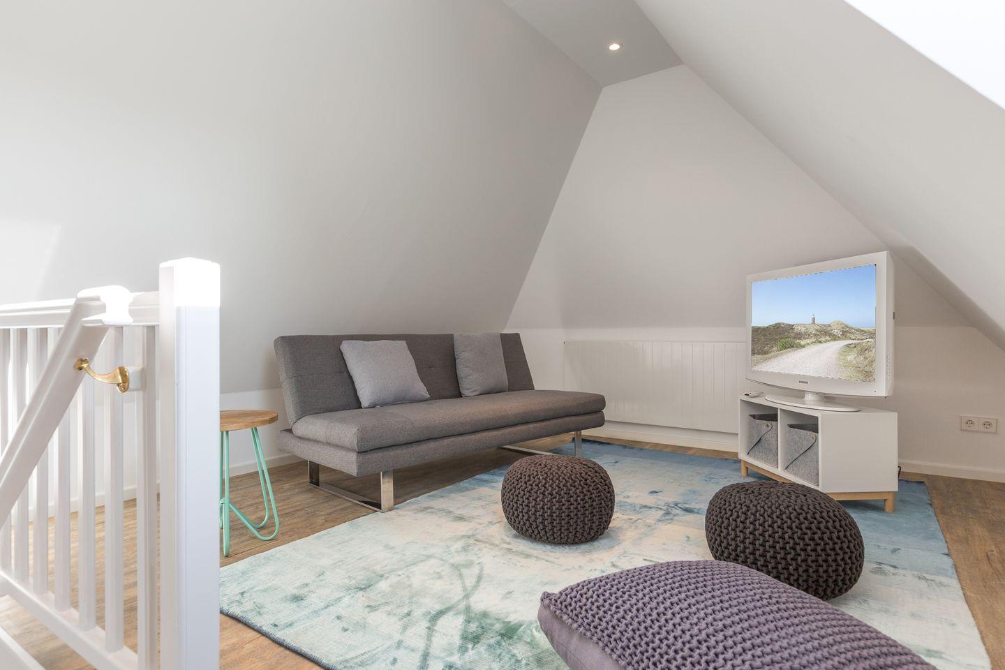 Das Dachgeschoss bildet einen ruhigen Abschluss des Hauses. Hier stehen ein Schlafzimmer mit zwei Einzelbetten sowie ein weiterer Raum mit Sofa und TV zur Verfügung – ideal als Rückzugsort für Kinder, Jugendliche oder für entspannte Stunden abseits des Trubels.