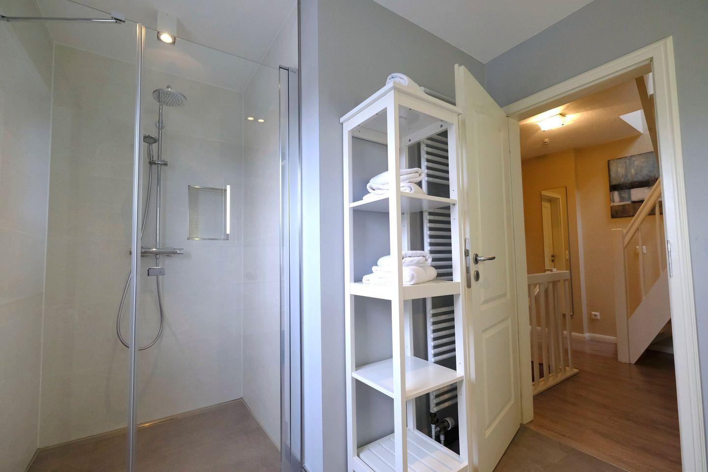 Das luxuriöse Badezimmer mit Waschbecken, Dusche und WC liegt ebenfalls auf dieser Etage. Im Spitzboden befindet sich das dritte Schlafzimmer mit zwei Einzelbetten, Flatscreen und Schreibtisch. In diesem Nichtraucherdomizil ist die Tierhaltung nicht erlaubt. Ein Pkw-Stellplatz steht Ihnen am Haus zur Verfügung. Das Ferienhaus verfügt weiterhin über einen Telefonanschuss mit Inland-Festnetz-Flatrate und natürlich kostenloses W-LAN. Sie können Sie Ihre mitgebrachten Fahrräder in der Gartenhütte unterstellen. Der Strand ist nur ca. 550 Meter entfernt!