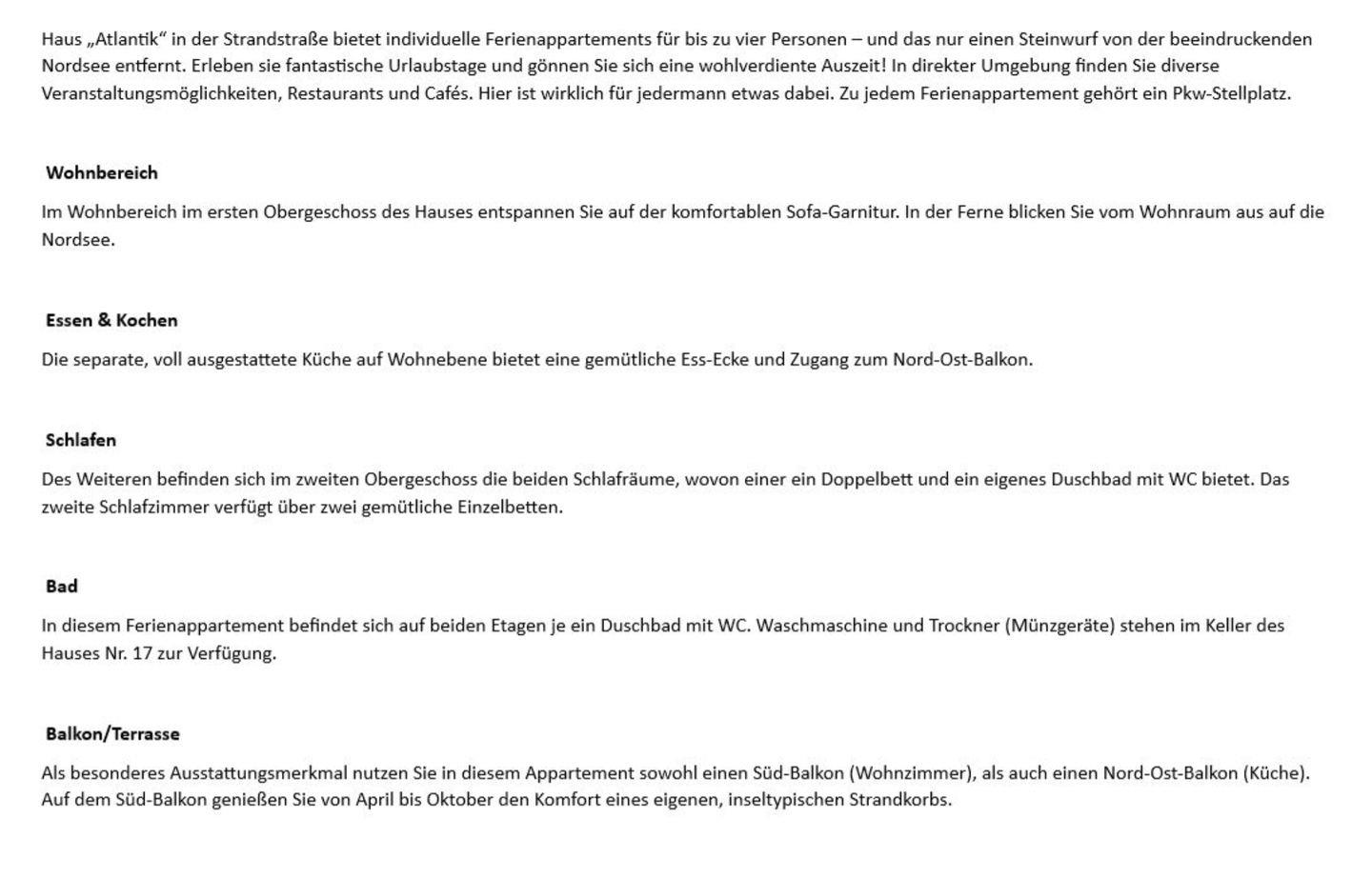 Als besonderes Ausstattungsmerkmal nutzen Sie in diesem Appartement sowohl einen Süd-Balkon (Wohnzimmer), als auch einen Nord-Ost-Balkon (Küche). Auf dem Süd-Balkon genießen Sie von April bis Oktober den Komfort eines eigenen, inseltypischen Strandkorbs.