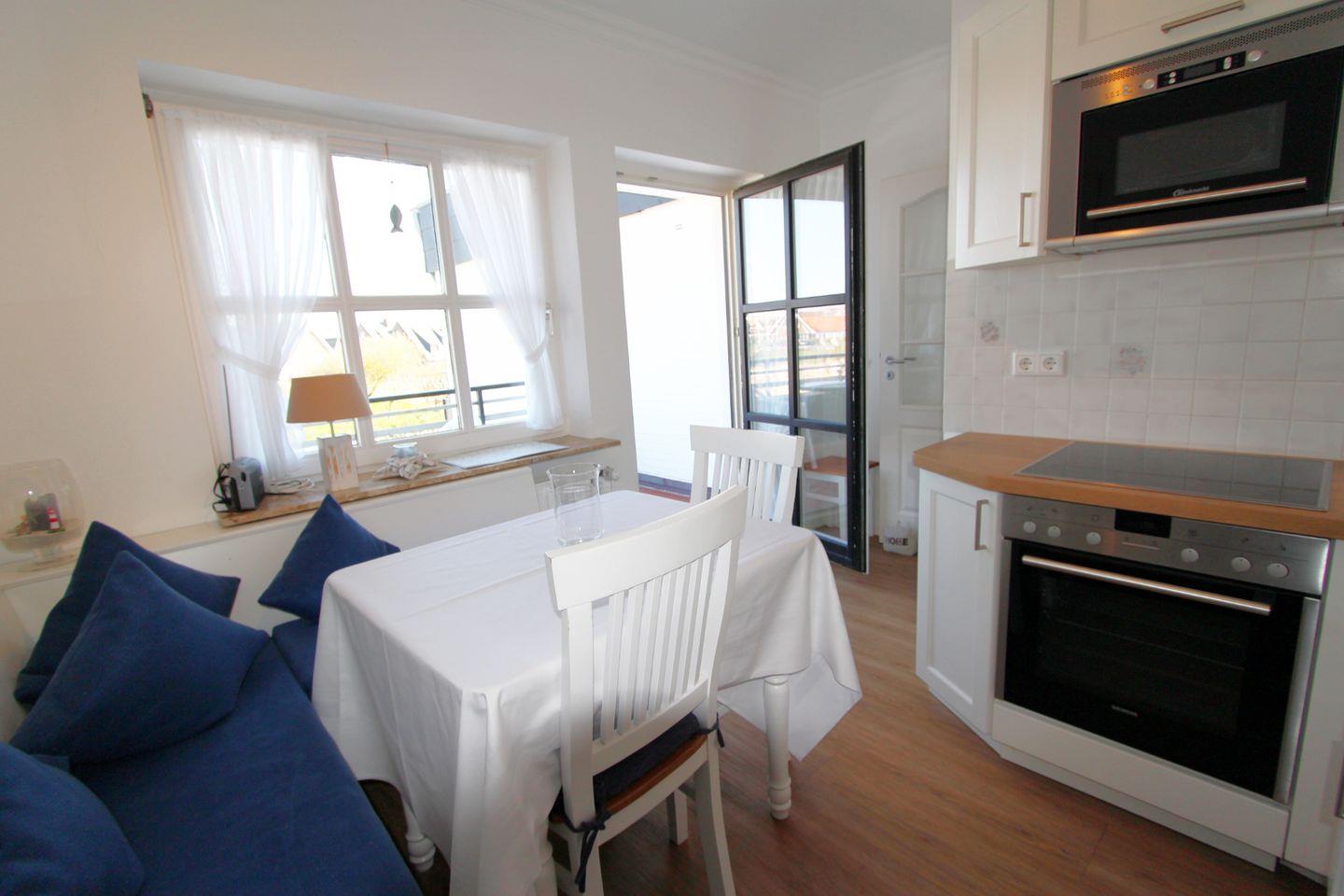 Die separate, voll ausgestattete Küche auf Wohnebene bietet eine gemütliche Ess-Ecke und Zugang zum Nord-Ost-Balkon.