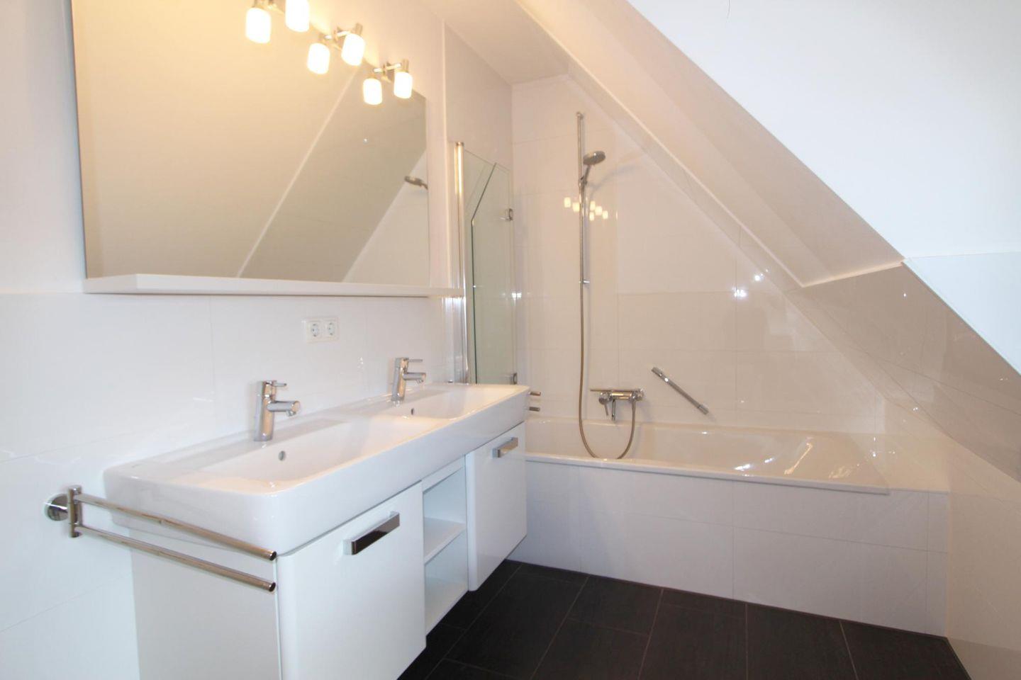 Im Badezimmer steht Ihnen eine großzügige Badewanne zur Verfügung, die auch als Dusche genutzt werden kann. Ferner bietet der Raum einen Doppelwaschtisch und WC.