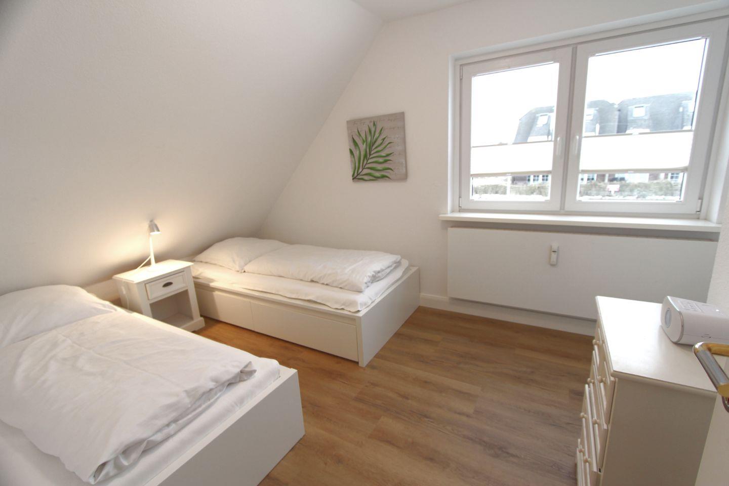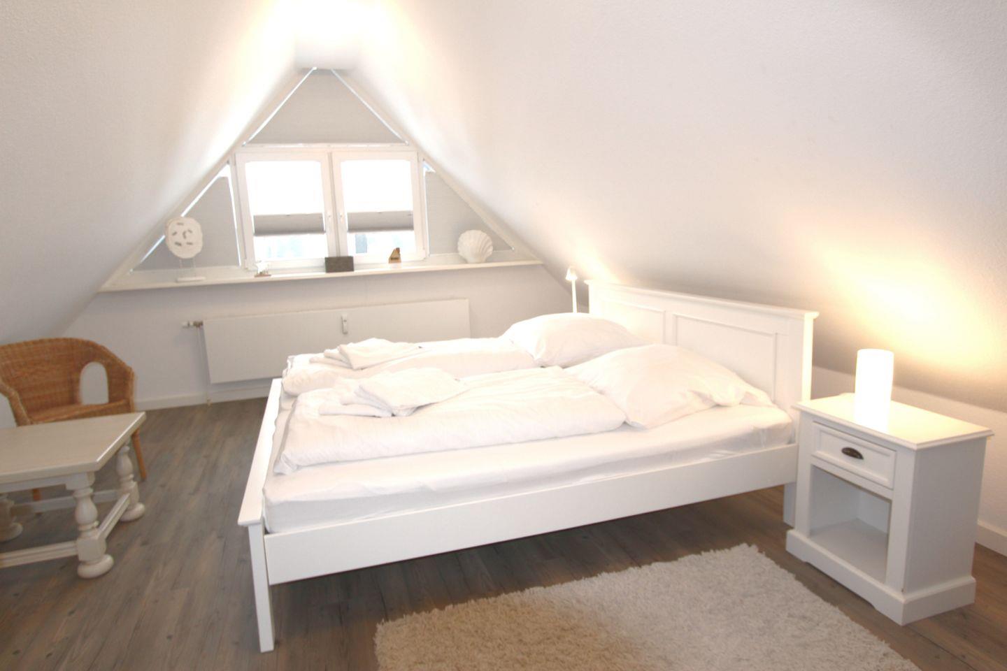 Im Obergeschoss auf einer Ebene mit Wohn- und Essbereich befindet sich ein Schlafzimmer mit zwei gemütlichen Einzelbetten. Darüber hinaus schlafen Sie im Dachgeschoss, das über eine Wendeltreppe zu erreichen ist, in einem komfortablen Doppelbett. Der Raum im Dachgeschoss ist durch eine Giebel-Fensterfront lichtdurchflutet.