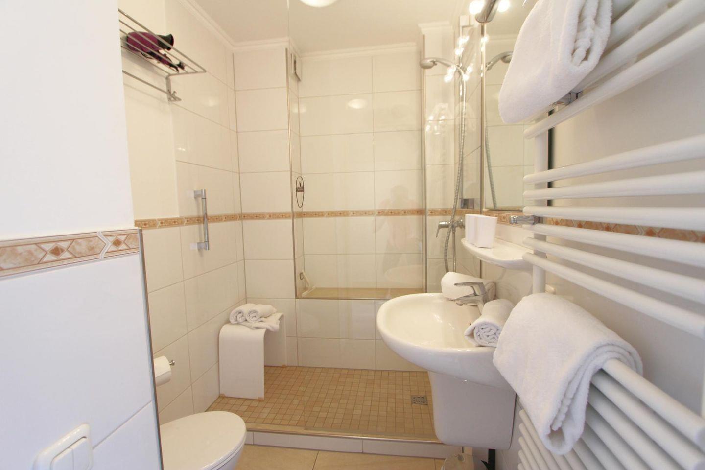 Das Badezimmer bietet eine große geräumige Dusche mit Glaswand und WC. Durch die hellen Fliesen wirkt der Raum hell und freundlich. Eine Waschmaschine steht als Münzgerät im Mieterkeller zur Verfügung.