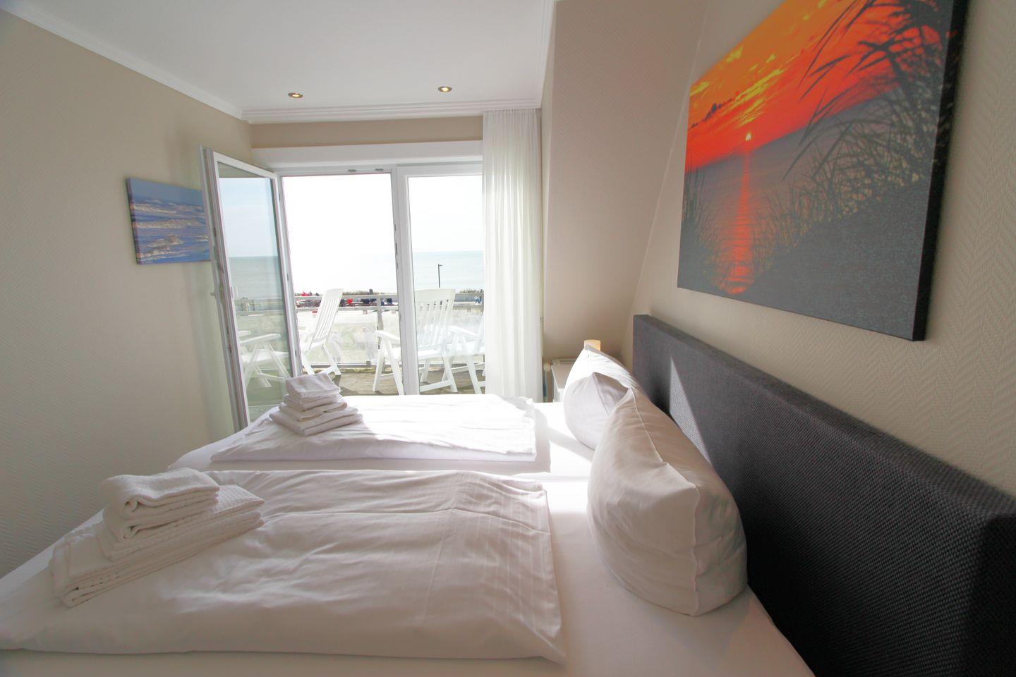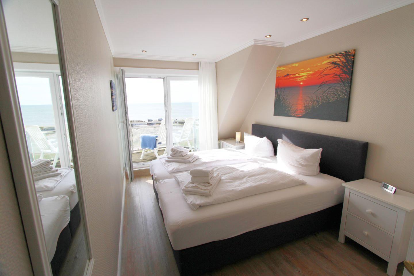 Diese Ferienwohnung bietet Ihnen zwei separate Schlafräume. Lassen Sie sich im Doppelschlafzimmer im Obergeschoss vom Rauschen des Meeres wecken. Sie genießen vom Bett aus Meerblick. Das Schlafzimmer im Obergeschoss ist mit zwei Einzelbetten ausgestattet, lichtdurchflutet und in friesischen Blau- und Weißtönen gestaltet.