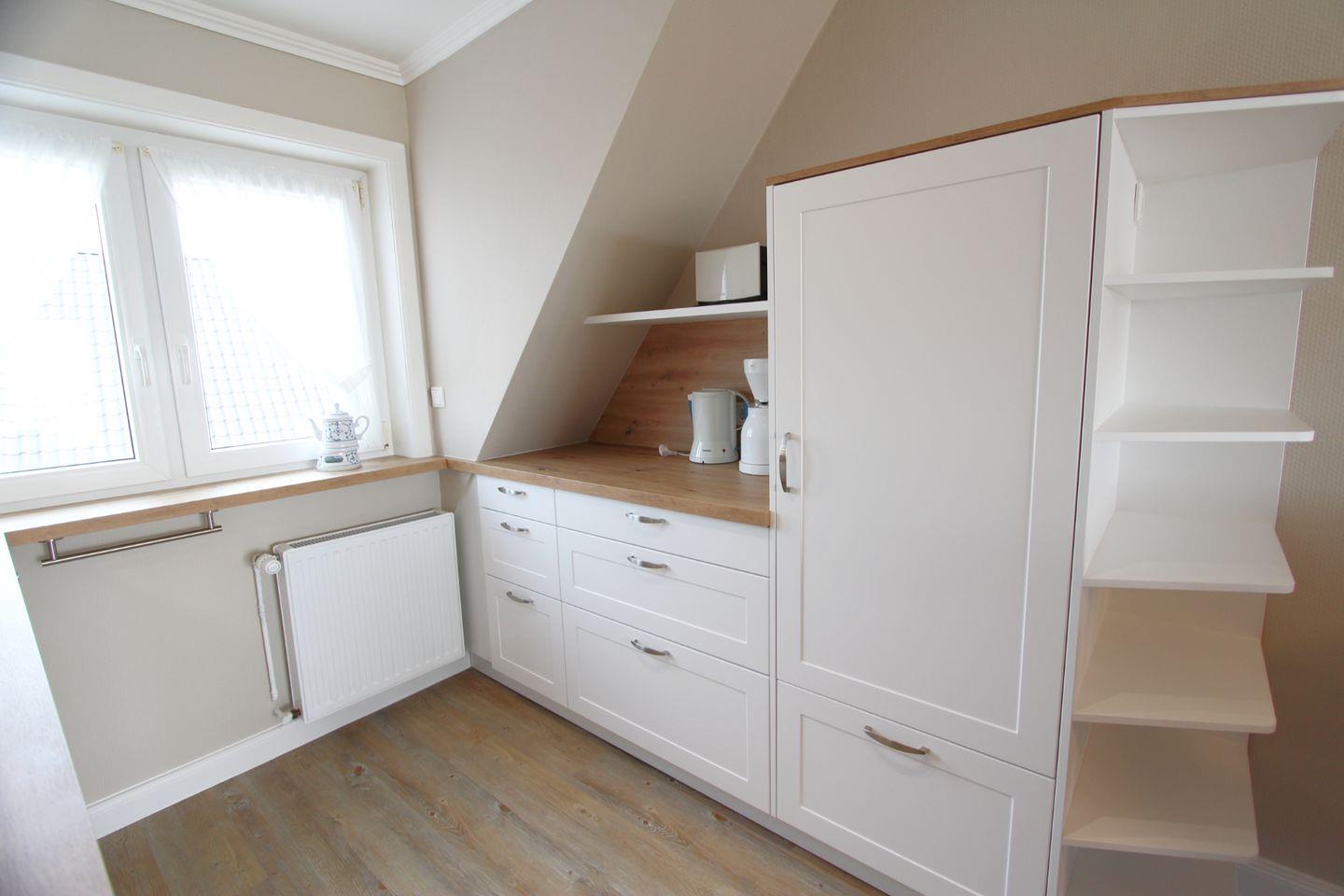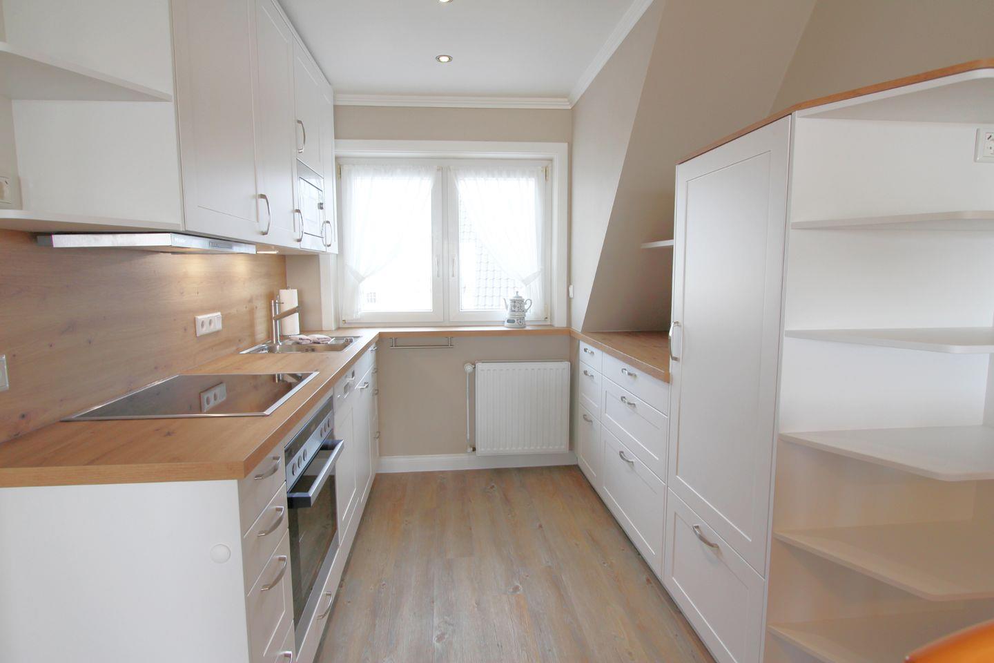 Die offene Küche bietet ausreichend Platz und Arbeitsflächen, um gemeinsam zu kochen. Im angrenzenden Essensbereich können bis zu vier Personen nach Herzenslust speisen.