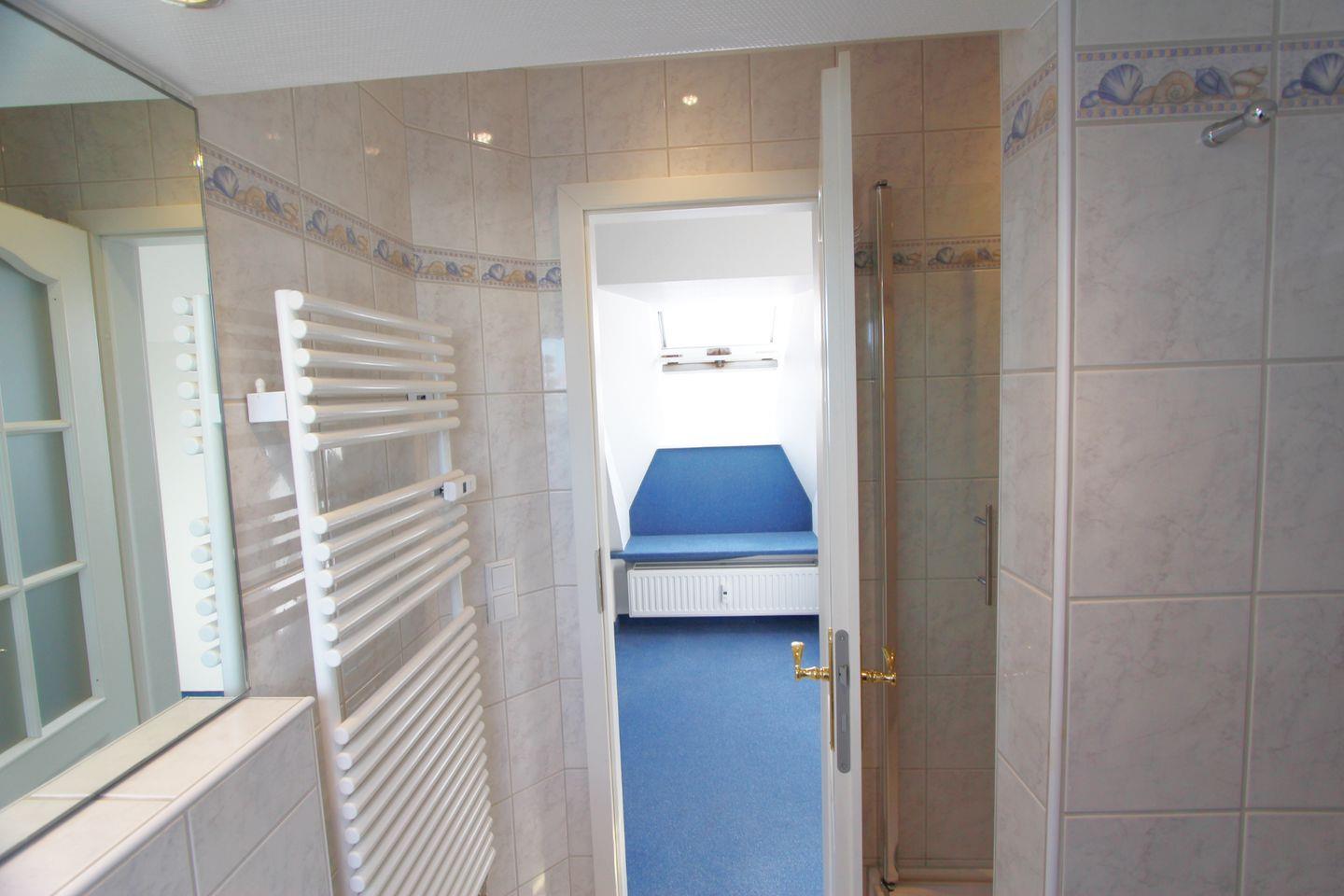 In dieser Ferienwohnung finden Sie zwei Badezimmer. Sowohl im Obergeschoss, als auch im Dachgeschoss befindet sich jeweils ein vollwertiges Duschbad mit WC. Durch die hellen Fliesen garantieren die Räume ein Wohlgefühl. Ferner stehen Ihnen eine Sauna, eine Waschmaschine und ein Trockner gegen Gebühr im Nebenhaus zur Verfügung.