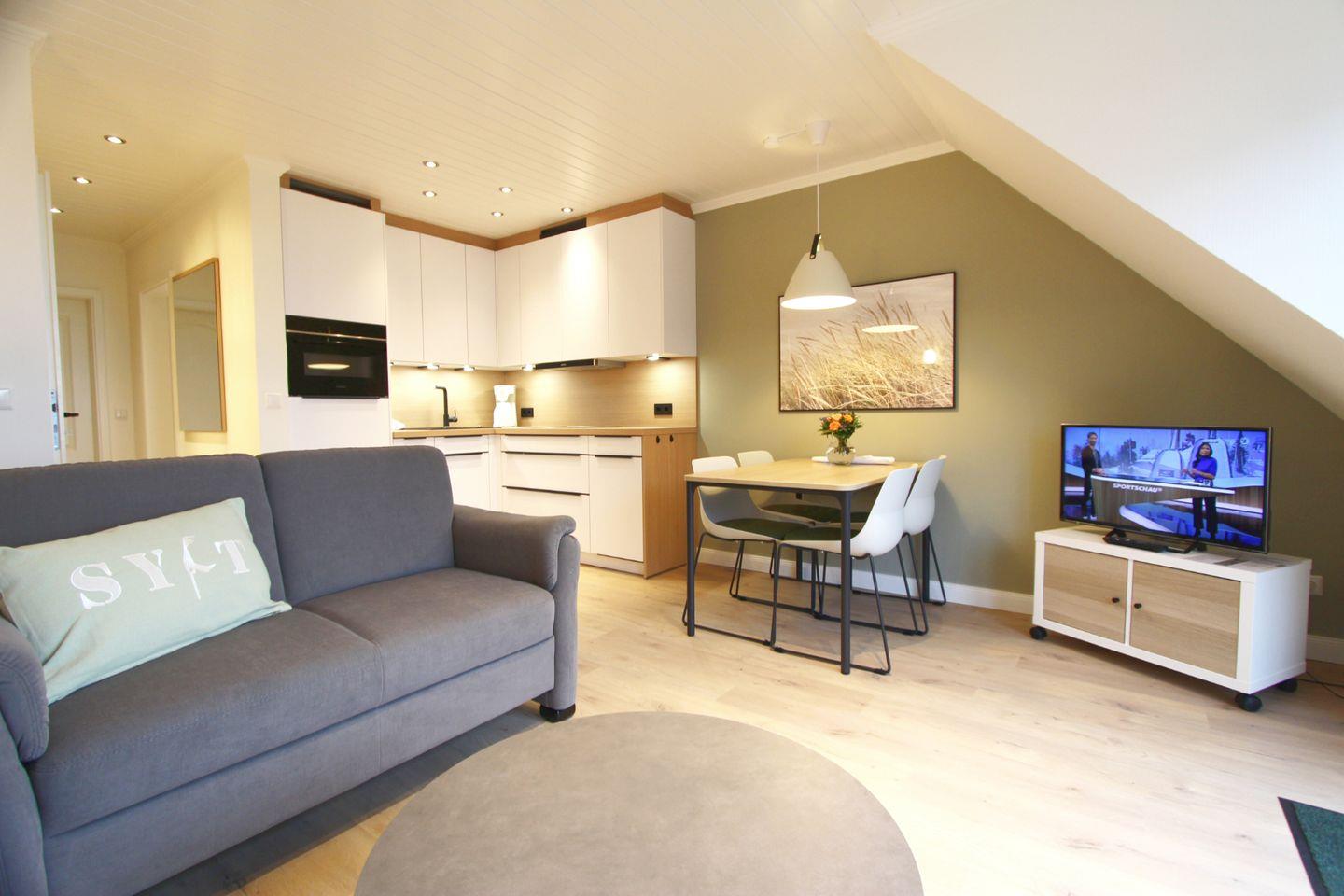 Der hell gestaltete Wohnbereich im Obergeschoss lädt mit einer bequemen Sitzecke zu Entspannung und Erholung ein. Highlight des Wohnbereiches ist der Meerblick!