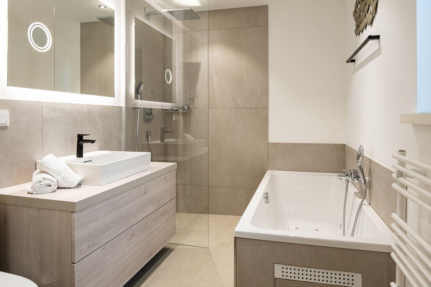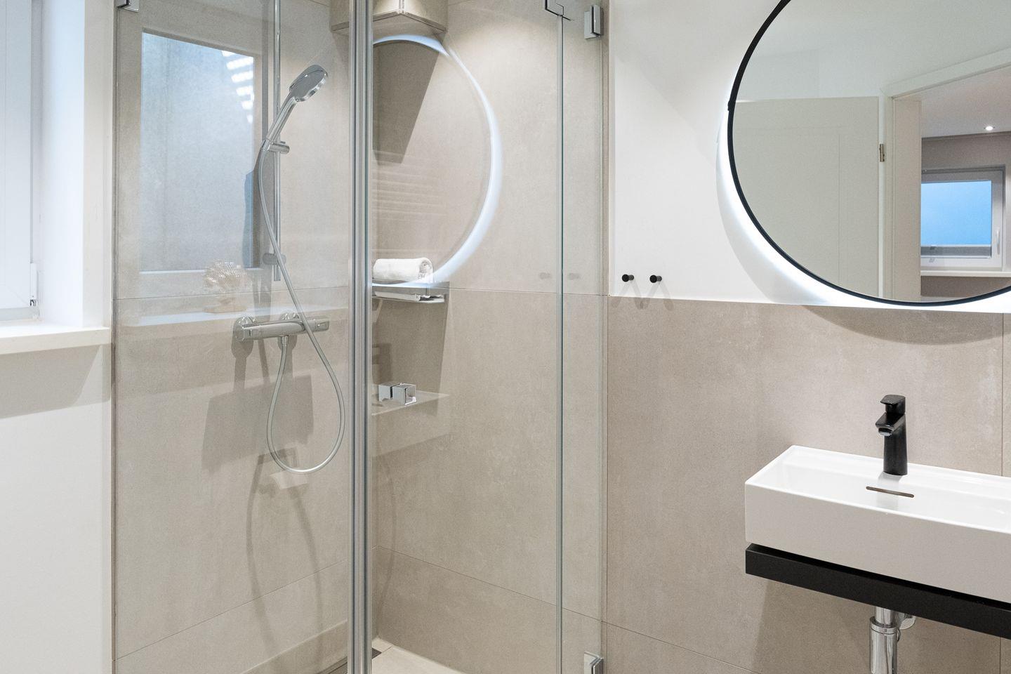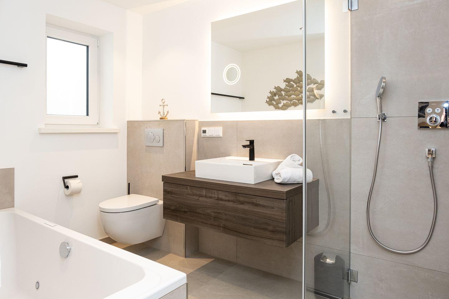 Im 1. Obergeschoss erwarten Sie zwei weitere komfortable Schlafzimmer mit Boxspringbetten und jeweils eigenem Badezimmer mit Dusche/WC. Ergänzt wird die Etage durch ein zusätzliches, kleineres Schlafzimmer mit Einzelbett, das sich besonders gut für Kinder oder eine zusätzliche Begleitperson eignet.