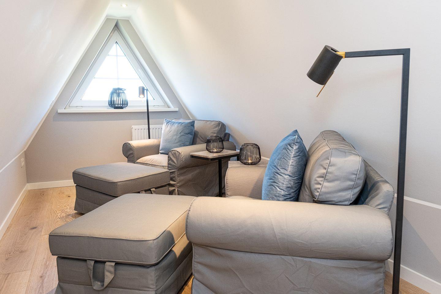 Ein weiteres charmantes Detail des Hauses befindet sich im Spitzboden des Reetdaches: Hier lädt eine gemütliche Leselounge zum Rückzug ein. Alternativ sorgt ein Tischkicker für Unterhaltung und gemeinsame Spieleabende.