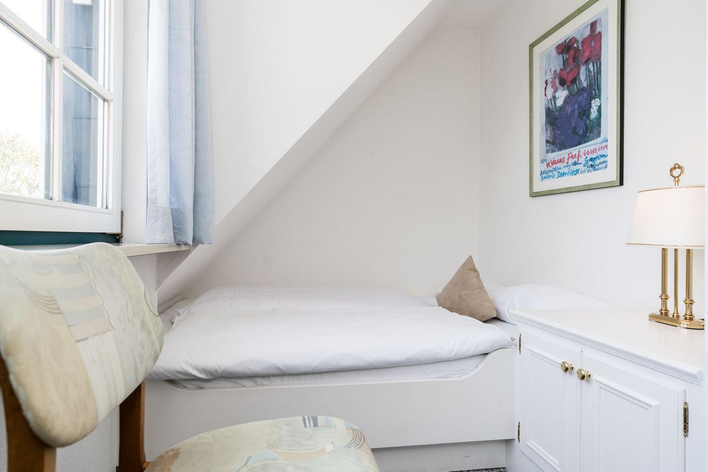 Die Unterkunft verteilt sich über 1. OG und DG. Im 1. OG. finden Sie das lichtdurchflutete Badezimmer, einen Schlafraum mit eingebautem großen Bett und einem Einbauschrank. Der Blick aus diesem Zimmer zeigt am Horizont den Kampener Leuchtturm. Im DG befindet sich ein weiteres Schlafzimmer mit einem Doppelbett. Dieses Zimmer ist geprägt vom großen Giebelfenster mit Blick über die Wiesen und Felder von Braderup bis hin zum Wattenmeer.
