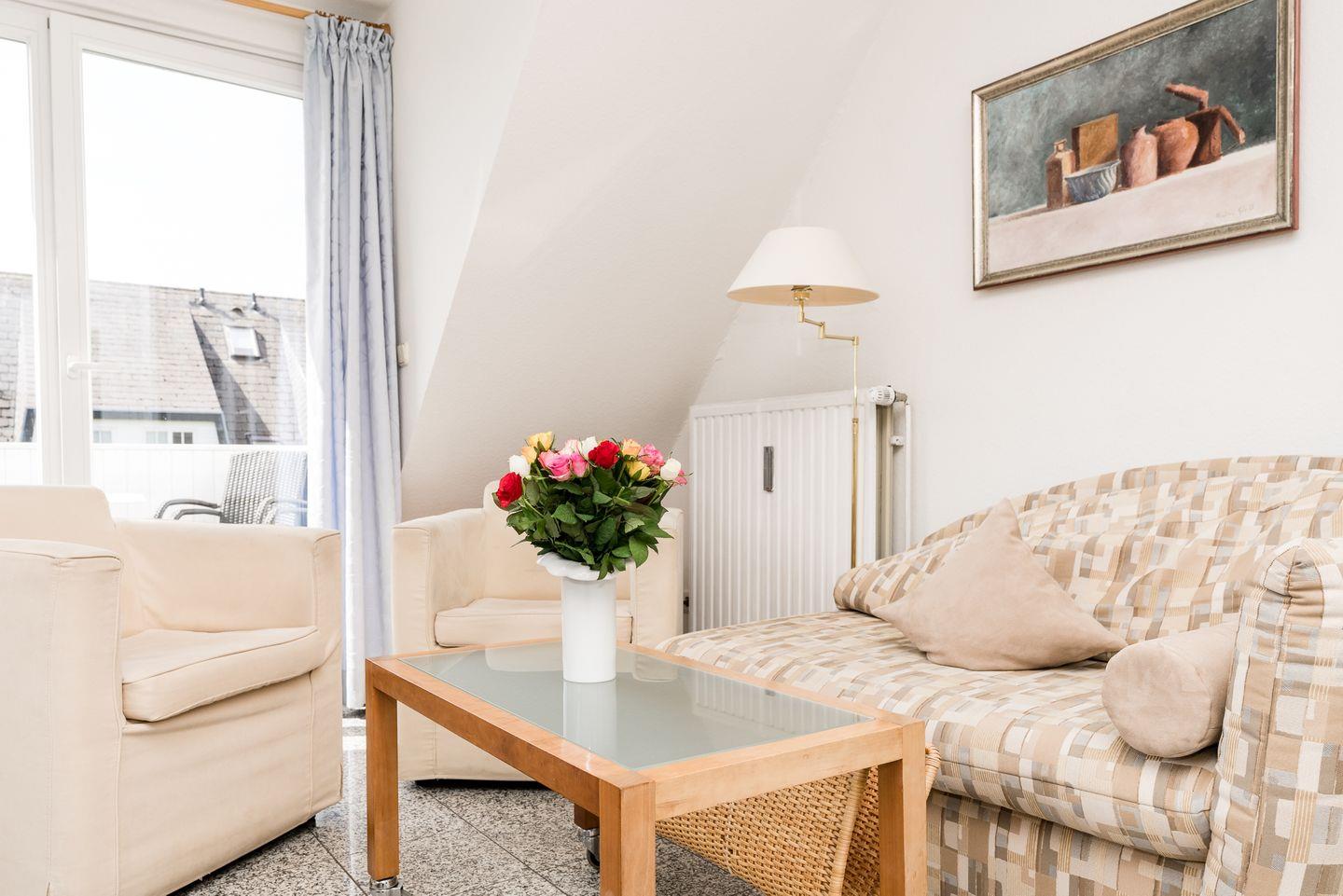 Das Wohnzimmer mit Küchenzeile ist ebenfalls mit Natursteinboden und sonstigen Natursteinbelegen (Tisch und Küchenarbeitsplatte) versehen. Die Einrichtung im Friesenstil bietet ein behagliches Ambiente, eine kleine Bibliothek sorgt für Abwechslung an Regentagen. Der Balkon mit Sichtschutz zur Nachbarwohnung ist nach Süden ausgerichtet. WLAN vorhanden (ohne Gewähr)