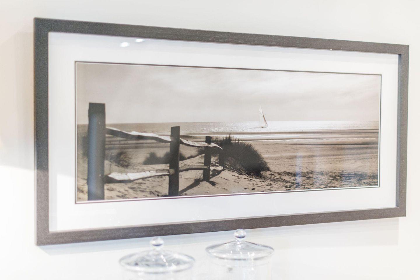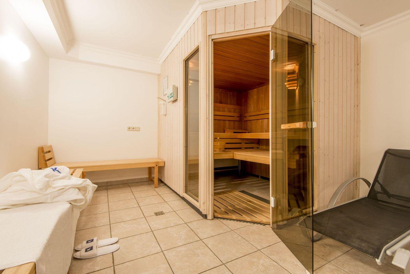 Das moderne Badezimmer ist mit einer Dusche, WC, Doppelwaschbecken, Handtuchwärmer und Föhn ausgestattet und bietet den perfekten Start in den Tag. Im gemeinschaftlichen Wellnessbereich mit Sauna und Ruheraum im Haus können Sie nach einem Strandtag wunderbar entspannen.