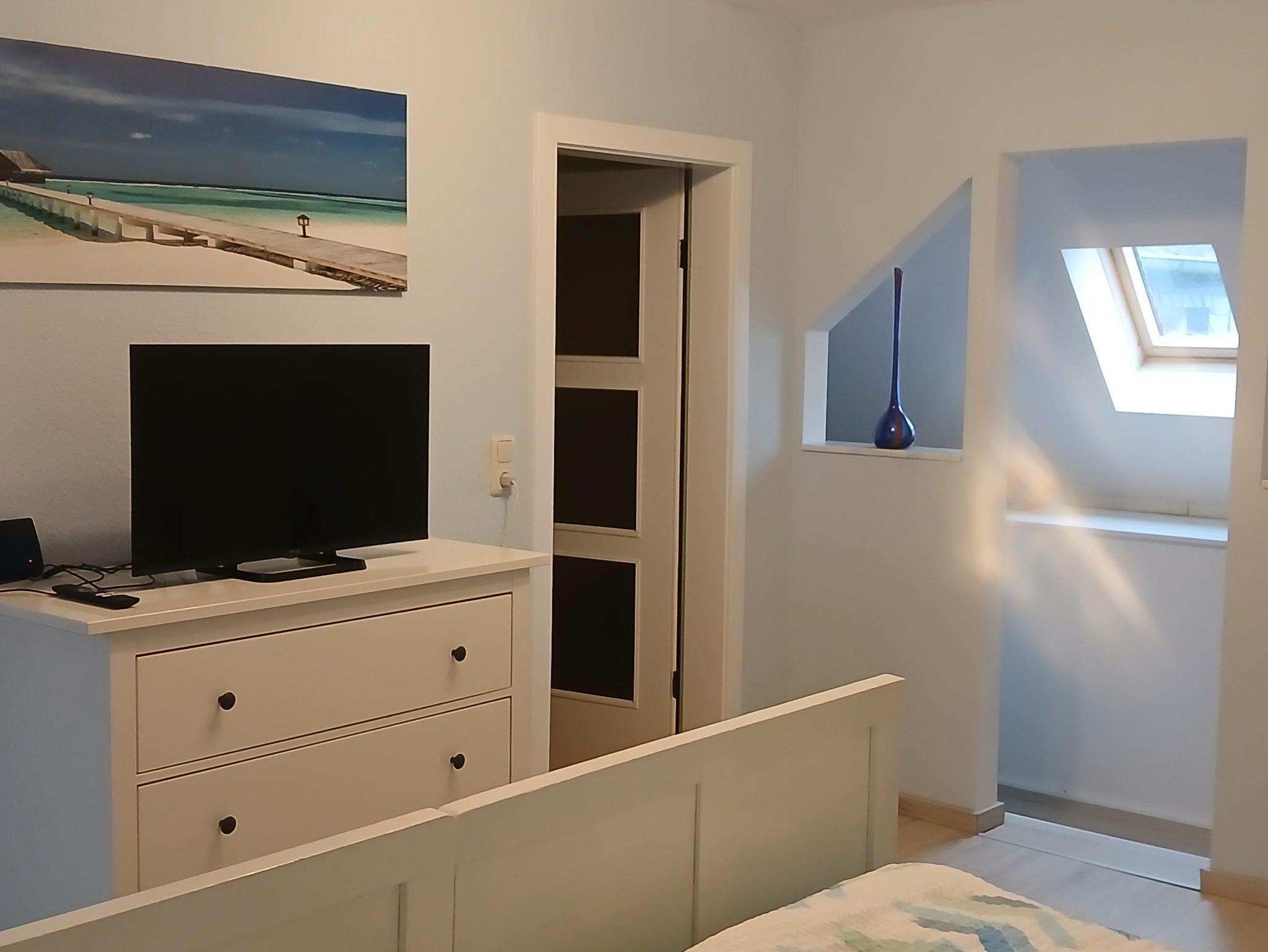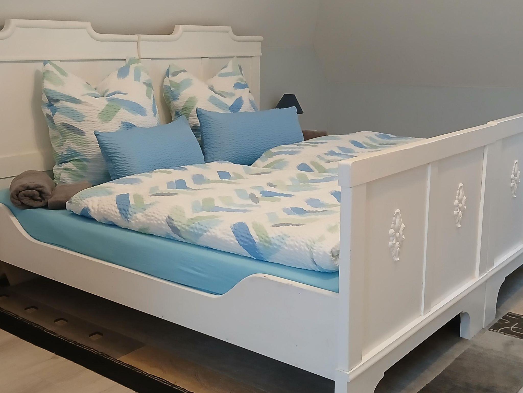 Die großzügige Ferienwohnung im Obergeschoss bietet Platz für bis zu sechs Personen und ist ideal für Familien oder kleine Gruppen. Zwei gemütliche Schlafzimmer sorgen für erholsame Nächte – eines mit einem bequemen Doppelbett und eines mit zwei Einzelbetten. Im offenen Wohnbereich mit Küche lädt ein ausziehbares kleines Doppelbett zum Entspannen oder als zusätzliche Schlafgelegenheit ein.