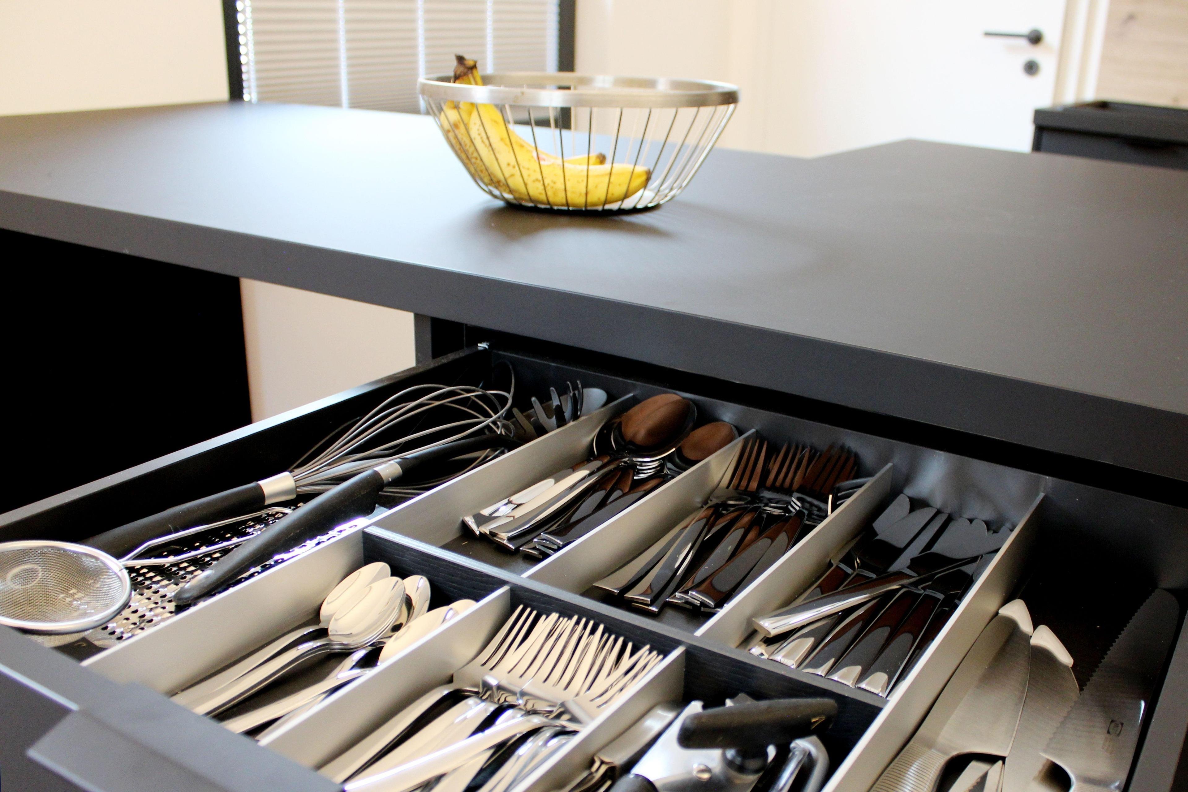 Die moderne Einbauküche ist voll ausgestattet und bietet ein kindersicheres Induktionskochfeld mit Töpfen und Pfanne, Kühlschrank mit Gefrierfach, Geschirrspüler, Wasserkocher, Backofen, Toaster, Mixer, Geschirr, Gläser & Besteck, und mehrere Kaffee- und Tee-Zubereitungsmöglichkeiten (Kaffeemaschine, French Press, Teekanne mit verschiedenen Siebeinsätzen).